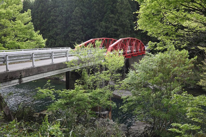 × [PR]上記の広告は3ヶ月以上新規記事投稿のないブログに表示されています。新しい記事を書く事で広告が消えます。 津和野町日原から北西、県道312号を国道488号に向けて走っていたら、突然、ボーストリングトラスが現れた。驚いた。これは津和野側(西)から益田側(東)を見ている。 これは逆、益田側(東)から津和野(西)。 いや、ボーストリングトラスではなく曲弦ワーレンかもしれない。曲弦ワーレンとされる松室大橋(日本橋梁製/1920)と見比べると、そっくりだ。 ==================================== ==================================== 益田側は県道312号と、旧国道488号の合流点。左下、\方向の道路が旧国道。いまは新道ができている。 …と思ってカシミール3Dで地図を見たら…。 地図が古い。行政地名はまだ「日原町」だ。こちらはまだ新道が記載されていない。赤い線はGPSログ、地図ほぼ中央、山の尾根で途切れているのが現在の新道のルートだ。調べると、この部分の数値地図は平成14年刊行のものが最新だ。(こちら) 閑話休題、須川橋。 昭和31年(1956)