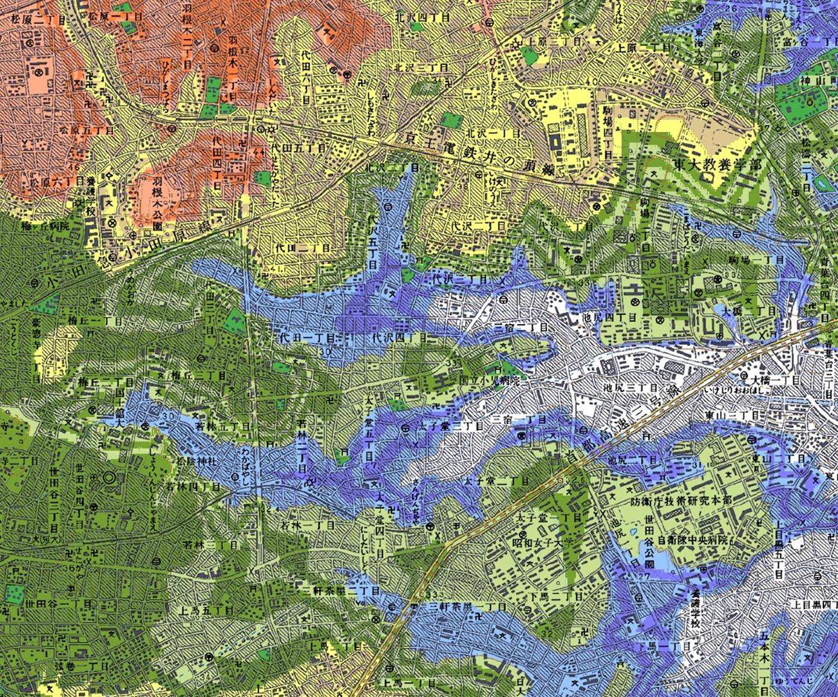 前日、ここを通ったときには、丸い穴から水がブワッと噴き出しているような感じだった。この写真のように堤体が滝になってはいなかった。 ところがこの日、すなわち7月16日(月)の午前には、このような状況になっていた。前日の写真を撮っておけば比較できたものを。 (前にも書いたな) なかなか「平常時」の画像がネットにないのだが、「大雨の後」というのがあった。まだまだ水量は少なく見えてしまうが、これを見ると、冒頭写真のような「上」だけでなく、「下」にも排水孔があるのがわかる。ああ、またここも再訪しなくては。。。 PR 【追記】 @fusamofuさんからの情報で、これは三省水工の「シーロック」標準型であることがわかった。採寸していないので、南号かはわからない。 「ニッチマニアの為に勝手に作り続ける」をスローガンに、極地的に興味を持ったモチーフを誰に頼まれたわけでもなくTシャツやてぬぐい等に商品化してくれるアパレルブランド(以上、exciteニュースより)、マニアパレルが下北沢に「テト家」をオープンした。3回の週末のみの期間限定だ。 詳細こちら。 もちろん行ってきた。 マニアパレルのバドンさんと初めてお会いしたのは、2008年12月19日にジュンク堂書店新宿店で開催された『ワンダーJAPAN公開編集会議』。そのとき、そのイベントとは直接の関係はないのに「テトぐるみを作ったのですが売れなくて。ここジュンク堂さんで扱ってますので是非」みたいなことをおっしゃっていた気がする。そのときは、いいな、と思ったけれど、ちょっと値も張ったので見送った。でも、今回は買ったよ! 東京に住んでる人にはテトラポッドといっても馴染みがないかもしれないけれど、私の新潟の実家からは海まで歩いて3分、そこに行けば必ずはテトラポッドが目に入る。そういうところで育った。もうずいぶん、子供の頃とは変わっちゃったけれど、いまはこう。「新潟島」の沖合に、ひたすらテトラポッドが並んでいる。 大きな地図で見る 私にとっての「冬の日本海」は、この、海面上3mくらい顔を出したテトラに波がぶつかり、その3倍くらいの高さにしぶきを上げる姿だ。もちろん空は鉛色。風は海から吹いてくる。 #イメージ画像(2000年代の新潟市。当時とはかなり異なる) また、母方の実家のすぐ近くには、デンカセメントのテトラポッド製造場があり、ズラリ並んだテトラにのぼったり、できたてのテトラのバリを取ったり、型枠に入ったりして遊んでいた。 #イメージ画像(これは2000年代の新潟市内) まあ、そんなこんなでテトラポッドは私の琴線に触れるものなのだ。 買っても、家にソファもないので持てあます(?)ことは容易に想像がつくけれど、意外にも家族に受けた。ホッとした。「ウイッグ受けに」という意見にはちょとアレだったが。 さて、「テト家」がある下北沢。@watanabejinさんが、「~沢だな」みたいなことを書いておられたので、カシミール3D+山旅倶楽部(10mメッシュ)で再現してみた。 きょうみぶかいのは、南側である。緑の部分が急角度で落ち込んでおり、青~白へと低地につながっている。白い部分は、池尻大橋から西に遡る暗渠の先端である。ひとつ尾根を挟んで南にも暗渠があり、池尻大橋につながっている。 世田谷区は全体的に道が細く曲がっており、「道路地図」を把握するのが難しいのだが(これは『上品ドライバー』でも言っていた)、この下北沢の南側のような地形であれば、なるほど道路の直線化などは難しいだろう。練馬区の平べったいところとは違うのだ。 それにしても。 住居表示により、「○沢」が大地の上にあったりするのもよくわかる。「○沢」だからといって、谷底にあるというわけではないことが、この地図でもよくわかろう。 東京駅の丸の内側、行幸地下ギャラリーで開催されている『土木コレクション2010 HANDS + EYES』を見てきた。先週は新宿駅の西口イベント広場で開催されていて、そちらに行った方から「行幸ギャラリーはガラス越しになるので、新宿のほうがいいよ」と言われていたのだが、あいにく都合がつかず、東京駅に行った。ガラス越し、とはこんな感じだ。 幸か不幸か、この時持っていったE-P1+20mmだと、ガラスにレンズ前端を押しつけると、ちょうど図面1枚が画角に収まる、というサイズのものが多かった。 この場所八重洲地下街に連なると思って銀座から歩いて行ったら、まず八重洲側を北口まで行き、連絡通路で丸の内に出てさらに折り返すという恐ろしいルートになってしまった。 この展示のタイトルはこうだ。 DOBOKU COLLECTION 2010