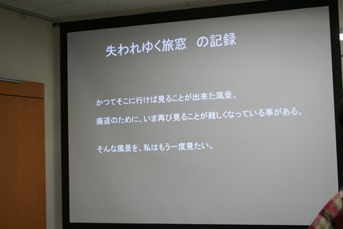 会場は20畳くらいのスペースで、たぶん椅子は30もなかったんじゃないかな。14時スタートのところ13時40分くらいに入ったら半分くらい埋まっていて、最前列に昨日も大阪でもお会いしたYさんがいらしたので隣に座らせていただく。うう、よっき氏の真正面、それも氏と喫茶店で打ち合わせしているかのような距離感。2つ下の写真が、その距離感を表している。私がこんなところに座ってしまうと圧迫感を感じるかもなー、とも思ったけれど気にしないことにしてそのままいると、14時に。すでに立ち見も10人以上になっていたと思う。 すぐ横には廃道写真のパネルが展示してあった。 さっそくトーク開始。1時間しかないからな。 トークは昨日とはまったく別物で、流用もない。丁寧に「見せるための」パワポファイルが作られている。このあたりはほんとうにすごい。そして、トークもまったくよどみなく、パワポなどなくても2時間3時間いけるほどに話が展開される。これは、氏の体全体に道の知識と道への愛が詰まっているからこそだと思う。そしてそれは、何度も何度も「自分にとって道とは何ぞや」という思索を繰り返した結果に違いない。あ、上の写真、後ろから撮られてる……(笑 そして、廃道属性を図にしてみる。 ……ん? #Pinky:stは、模型製作者にはなじみ深いのクレオス製フィギュア。 そして、話は本題に戻り、「廃道の魅力」を総括する。 画像ですべてがわかるだろう。このころになると、会場はオープンスペースなので、これ目当てじゃない人も立ち止まって聞いている。そして、これ目当ての立ち見の人も増えている! 立ち見だけで20人以上いたと思う。 終了後、本の販売&サイン会。会場はしばらく雑談に使っていていいと言われたので、うだうだ(?)していた。 していたが、撤収が始まったのとよっきれんさんが出てしまうというので我々も撤収。noganaさん、あづさ2号さん、まききさん、そのお友達さん、Yさん、kubodiさんと7人でお茶でも…ということに。 このときまで、中学生(?)の「廃道ボーイ」もいたが、用事があるとのことでここでお別れ。 野郎7人で外に出るも、駅前なので飲み屋とファストフードしかない。マック、珈琲館、プロントは人数の都合で入れず、ぶらぶら歩いていたらスタバがあったのでそこに収まる。小一時間のつもりが、あっというまに18時、19時、そして19時半。3時間半ほども経過してしまった。ドリンク1杯で。 さすがにそんな時間になったので撤収。三々五々、帰路に就きいた。 こうしてイベントが重なると、毎回会場で顔を合わせる方々も増え、自然に話をするようにもなる。酷道などに比べて廃道は規模が小さいからか、それともよっきれん氏が基本的にソロで行動するので、つるまない、という印象があったが、ここにきてリアルでのコミュニティが生まれつつあると思う。決して内輪で固まらない方向で、こうした関係が発展していけば、私としても友人が増えて嬉しいし、こうしたものに関心を持つ人も増えてくれるのではないかと思っている。 道に関する趣味というのは、マスの小ささが幸いして、いまのところ、わりとみな同じ方向を向いている気がする。そして、未開拓な分野があまりに多いため、それぞれがそれぞれの好みで探求している段階だと思う。鉄道で例えれば、まだ各地方の鉄道史、各鉄道の車両、文化をひとつずつ解明している段階で、それらすべてを踏まえた日本全体の鉄道史が書けない状態。全容解明=趣味として一般化するには、もしかしたら、まだ誰も気づいていない観点の研究が必要なのかもしれない。でも、いつか。我々が作る本、あるいは活動が、いろいろなことのきっかけになればいいと思っている。 最後に、こうした機会を設けてくださった、大阪/昨日/本日の企画をされたイカロス出版の大野さんに感謝申し上げます。 PR |