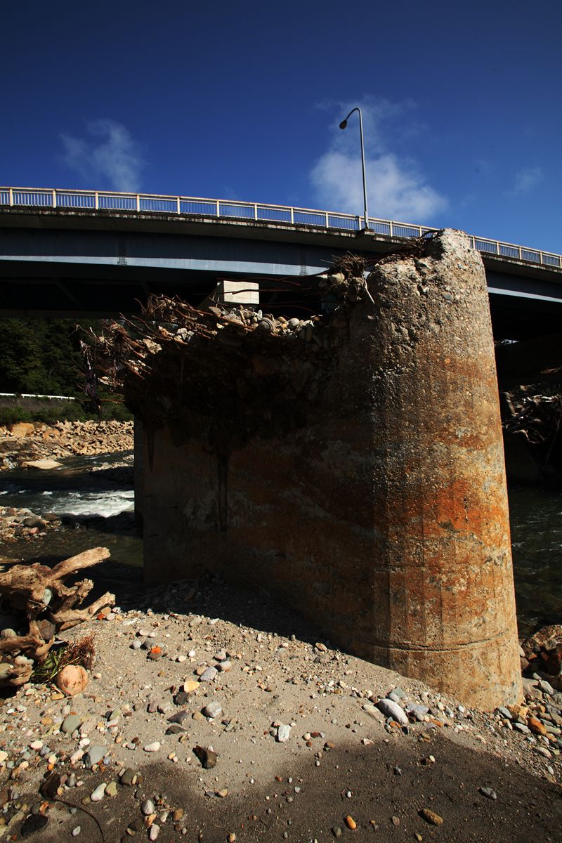× [PR]上記の広告は3ヶ月以上新規記事投稿のないブログに表示されています。新しい記事を書く事で広告が消えます。 只見線の「会津川口」(金山町)があるあたりは、1955年の市町村合併まで川口村といった。周辺の沼沢村、本名村、横田村とあわせて金山村となったあと、1958年に町制施行して現在に至っている。 「川口」というのは、その名の通り、只見川と野尻川の合流地点であることに由来する。例えば、新潟県の「越後川口」は、信濃川と魚野川のそれである(埼玉県の川口市はこの類ではないようだ)。この川口橋は、国道252号が、野尻川が只見川と合流する直前の場所に架かっている。 最初に言い訳をしておくと、このときは、橋脚に見とれてそれをどう撮るかばかり考えていて、記録として必要な写真をずいぶんと撮らずにいてしまった。なにしろ川口橋(現橋)の写真がほとんどない。銘板があるかどうかすら調べていない。反省する。 この写真でわかるとおり、川口橋の上流側に2組、旧橋の橋脚が残っている。そして、よく見るとコンクリートの桁らしきものも落ちている。 国道252号のこの区間は、1990年に川口トンネルとともに開通した(はずだ。トンネルのみしか確認できていない、要確認)。それ以前は、いまは橋脚しか残されていない旧橋と、川口トンネルのある山塊を北に迂回するルート(現在は通行止め)であった。『改訂新版カシミール3D入門編』に同梱されていた2万5000図が、まだ旧ルートだったのでそれを掲載する(入手できる最新のもの、を使用したのだが、ウオッちずは更新されていたものの、データは未更新だったようだ)。 ・地図A 川口トンネルがまだ描かれていない。また、川口橋の描かれ方が「/」のような角度がついている。 ・地図B 川口トンネルが開通している。川口橋の描かれ方が「-」となっている。川沿いに迂回する道は国道指定から外されている。 旧橋の時代を航空写真で見るとこうだ。 上の「地図A」の時代のものである。川口橋は「/」の角度である。 冒頭写真の2組の橋脚の正体はまったく調べていないが、橋梁史年表によれば、 という記載(抜粋)がある。これは、旧橋なのか、旧旧橋なのか。 現状のみを報告する。 旧橋(上)の上面は崩壊して鉄筋が剥き出しになっている。旧旧橋の上面には鉄の部材が三つと、コンクリートの突起が見える。 そして、旧橋・旧旧橋の高さはこれくらいである。豪雨の前、通常時でも、これらの橋脚は水面下にあったようだ。 旧橋の橋台の下部のえぐれ方がすごい。テトラ(じゃないよな、なんと言えばいいのだろう)が剥き出しになってゴロゴロしているのは、護岸がえぐられた跡である。それでもなお、旧旧橋の橋台が残っている。 この川口橋については、いろいろと知りたいこともあるのだが、今後の課題として記憶しておく。 PR |