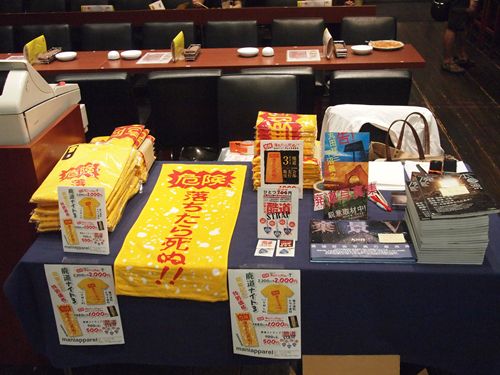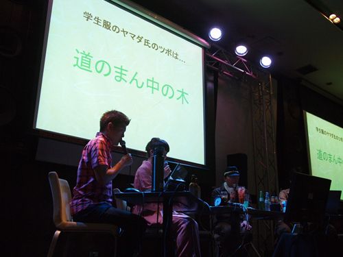 × [PR]上記の広告は3ヶ月以上新規記事投稿のないブログに表示されています。新しい記事を書く事で広告が消えます。 開場は17時30分だが、16時に会場入り。販売品などをセッティングしていると、ヨッキれん・ミリンダ細田・トリ各氏がご到着。すぐに準備を開始。し、同時に「特別メニュー」の名称も検討。 オレンジ色のカクテル、「三島の黄昏」は比較的スムーズに決まったが、対応する緑をどうするか。「○○隧道の苔」「対応しないなー」「三島に対応して藤村紫朗か」「マイナーすぐる」…。細田氏「グリーン(自粛)」ヨッキ氏「却下!」…。悩んだ末、「三島の青春」となった。副題に「和歌夫人」。これくらいのわけのわからなさがちょうどいい。 会場限定メニューはこんなの。「三島の黄昏」は撮り損ねた。。。 Tシャツは完売、タオルは50本近く売れた。すごい。買い逃した方は、上記サイトをチェック。通販、あるいはジュンク堂新宿店などで販売されるかもしれない。 モチーフはこちら。有名な看板だ。バドンさんは数々の土木をモチーフにしたTシャツや手ぬぐいを作っておられ、私もいくつか持っている。 私は『廃道本』のほかに、現在、丸田祥三さん(@malta_shozo、ブログはこちら)と制作中の写真集の告知をした。ご来場いただいた方々にはチラシを配布させていただいた。丸田さんについては、このブログの他のエントリをご覧ください。 リハは着々と進行。出演する3名の着座位置は、私から提案してカルカルの横山店長とヨッキさんで、トリさんと細田さんを囲む形になった。そのほうが、両側に進行役がいたほうが、話を振りやすいと思ったからだ。リハ中、トリさんの廃道好きの説明をいろいろ展開しようとしていたが、結局お蔵入りしたようだ。 今回、チケットは早々にソールドアウト。そのため、入場は整理番号順になる。開場時刻の17時30分にはかなりの方がお見えになっていた。初めての方もけっこういらっしゃったようで、全席自由にとまどっていた方もおられた。 今回は「女性は500円引き」とした。その試みにはいろいろなもくろみがあったのだが、男性に連れてこられた女性もいらした一方、お一人でこられた女性も。 約1時間後の18時30分、スタート! 以下、ヨッキさん・トリさんの顔が隠れてしまっているカットが多いが、私が座っていた席の都合なので御容赦いただきたい。 乾杯! まずは自己紹介。この手のイベントは、出演者を知っているかどうかで楽しみ方も随分違うので、かなり重要。ヨッキさんの自己紹介動画(7分!)が音楽と非常にマッチしていて爆笑。そして、ついに廃道が海外で紹介されたという報告。 続いて「おぶろぐ」で募集した「私の道路萌えポイント」。全プレゼンを掲載するが、ネタ数は一部カットさせていただく。 (1)ナトリウムランプ萌え(すどきち氏) すどきち氏は、ナトリウムランプが落ちてきて割れたりしているのに遭遇するとハァハァするらしい。 (2)道の真ん中の木(学生服のヤマダ氏) (3)50高(nogana氏) 廃止された道路標示だ。高速車/中速車/低速車という区別あった時代のもの。こんなの。 簡単に補足する。 現在、速度制限のない道路での自動車の最高速度は60km/h(原付等30km/h)。1992年10月末までは、大型貨物・大型特殊・軽二輪などは50km/hとされており、それを「中速車」と呼んでいた。「50高」とは、「高速車」つまり乗用車、自動二輪なども50km制限ですよ、という表示である。「40高中」となれば、高速車も中速車も40km/h制限であるということ。その表示がいまだに残っているところや、表示する必要がないのに新規に描かれたりしている画像が展開された。 (4)都市部の未成道の風景(kubodi氏) 横山さん(ヨッキさんだったかも)が「都市計画道路が好きな人!」と会場に問うと「ハイ!」「ハイ!」「ハイ!」と、非常に多くの賛同者が現れた萌えポイント。数十年という単位で進行する都市計画道路。とりあえず用地買収だけしてあったり、一部で工事が途切れていたりする部分が好きという。みな共感。 上の画像は横浜市の道路の終端部に放置されていたリヤカー。荷台を竹が貫通しており、竹を切らないとリヤカーは動かせない。リヤカーがなくなるときは、ここが道路になるとき。「廃」と「未成」が同居しているような気がした。 ここで休憩。 再開。ここから第二部、トリ氏と細田氏は「探索時の正装」に着替えているのだが、コーナーが続いているためその説明がなかったので気がつかなかった人もいたかも…。細田氏は「いつものツナギ」で電車に乗っていらしている。 その細田氏のツナギにYUKI TORIIのタグがついていたのをある女性が発見。「でも学生のときに作業服屋で買ったんですよ」と細田氏。奥方がシャレで縫い付けた? でも廃道探索を嫌悪されてるようだしなあ…。YUKi TORII、私は男なのでよくわからず、検索したら「パリコレに毎年出てる」とか書いてあったようなブランドらしい。 (5)橋桁の床版(うさ★ネコサンド氏) (6)旧型道路