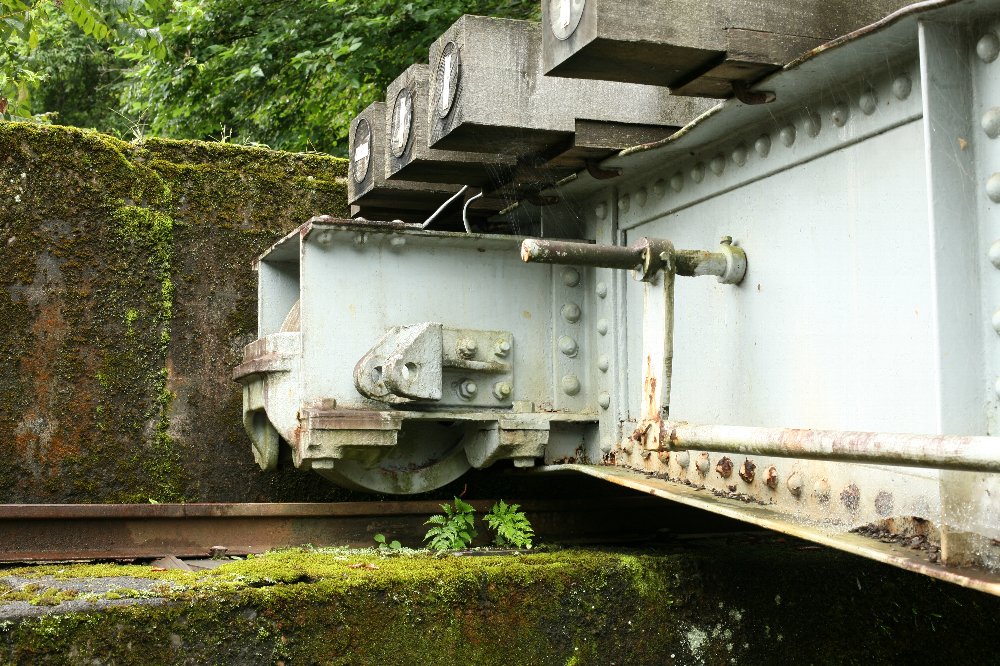 ここにはアメリカン・ブリッジ製の桁を擁する転車台がある。 もともとは官設鉄道の岐阜駅で使用するために作られたらしい。 その後、越美北線の開通に伴い、この北濃駅に移設された。 1934年、昭和でいえば9年のことだ。 長良川鉄道に転換されたあとでも、この転車台は使用されていた。 いつから使用されなくなったのかは不詳だが、知人によれば 10年ほど前までは手動で回して遊べるような状態だったらしい。 いまは国の登録有形文化財となり、そのような行為はできなくなった。 誰もが近寄れる状態であり、その気になれば上に乗ったりすることもできるのは嬉しいことだ。 ピット内は泥がたまっている。 当日は雨が降っていたために水がたまり、あまり降りたくなかったが・・・。 製造銘板。斜めってしまった・・・。 触れるほどの距離で銘板が眺められる幸せ。 こんな貴重なものを野ざらしにしておいて、盗難の心配はないのだろうか。 ・・・ないか。 現在は、桁の前後方向にしか線路がなく、方向転回以外に使用できない。 昭和58年発行の『国鉄全線各駅停車6 中央・上信越440駅』(宮脇俊三・原田勝正編 小学館)に 北濃駅の構内配線が記載されているが、その時点でも棒線である。 ロック機構は写真のとおり。 レールは微妙にズレているが、内側に面取りがしてあり、 これくらいのズレでは脱線しないようになっている。 こんなピットのあるところで脱線なぞしたら大事である。 そして、このロック機構は、一端のハンドルで操作したら他端も作用するよう、 桁側面のリンクを介してつながっている。 そして、桁の端部にある案内輪(桁端車輪)である。 桁端車輪を間近で見たのは初めてだった。 フランジのない、幅の広い車輪であった。 そして、浮いている。 桁は、中央支承と呼ばれるヤジロベエの足にあたる部分を重心にしてバランスしており、 車両がないときもあるときも、基本的に重量は中央支承が受ける構造である。 雨が降ったりやんだりする中、撮影しているうちに、 列車が入ってきて出ていった。 それに乗る人も、突如として現れ、乗り込んでいった。 PR 磐越西線日出谷~鹿瀬間の深戸橋梁の中央径間は、 1983年に新しい桁に架け替えられた。 その方法は、下の写真のように横から新たな躯体を挿入し、 古いものを川に落とすという方法で、日本では初めての手法であった。 落橋の際、橋脚を傷つける可能性もあったというが、無事であった。 下の写真、寄贈者の名前を間違うなよ、新津鉄道資料館。 というのはともかく、施工は横河工事だが、桁製作は宮地鉄工所である。 土木学会の資料『歴史的鋼橋』では「支間を1.2m短縮して使用」とあるが、 手元の『新鉄局五十年史』に掲載されている表によれば、 白田切川橋梁の支間は90.0m、深戸橋梁の支間は92.2mとある。 数字があわない。 しかし、記事中に挿入された図では、支間は93.4mであり、こちらが正解であろう。 側径間、即ち短いプラットトラスはオリジナルのアメリカン・ブリッジ製だ。 新たに架けられたトラス桁は新造されたものではなく、信越本線妙高高原~関山間の 白田切川橋梁を転用したものだ。 このトラス桁は、元々は岩手県の大船渡線北上川橋梁として製作されたものだが、 昭和53年5月18日早朝に現地付近で大型の土砂災害があり、 その復旧のために急遽振り向けられたのだ。 土砂災害は死者13名、家屋全半壊16戸というほどのものであった。 復旧は9月6日であった。 この災害に伴い、白田切川の改修工事が開始され、 あわせて信越本線も、複線化を見据えた線路移設が実施された。 岩手県から転用されたトラス桁は、この区間が新線に切り替えられるまでの約5年間使用され、 昭和57年9月20日に使用が停止された。 こうして、流転のトラス桁となったのである。 なお、新線のトラス桁は複線用であるが、線路は単線である。 当時、複線化工事をどこまで見据えていたのかは不明だが、 昭和55年9月17日に黒姫~妙高高原間の複線化をシオに、 昭和58年8月には複線化工事が凍結された。 当時の国鉄を取り巻く状況からいえば、そういうものなのだろう。 同時に複線化が凍結されたのは羽越本線である。白新線もそうかもしれない。 ついでに書くと、昭和50年代後半に磐越西線のピントラス5連3カ所が更新された。 他の2つとは、 ・安座川橋梁(上野尻~徳沢) ・阿賀野川御前(三川~五十島) であった。 当時、ピントラス特有の変状が多発し、補修工事を多く行っていた。 新鉄局としては、順次架け替えを意図していたような書きぶりであるが、 その後は架け替え作業のないまま、現在に至っている。