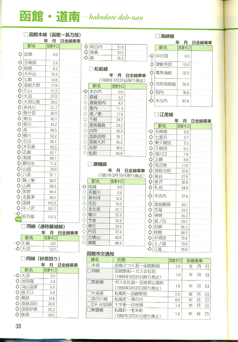 氏の『棄景』(1993年)には、大変なショックを受けた。その題材に、その表現に。私の廃もののルーツは過去に書いたことがあるが、そのころの心持ちで言えば、1991年に北海道に鉄道旅行に行った際、函館駅で購入した堀淳一氏の『北海道廃線跡を紀行する』(北海道新聞社)の内容に想像をたくましくしていた頃だ。そのころはインターネットも携帯電話もなく、すべての情報は紙媒体から得ていた。なにかの雑誌に、『棄景』の書評があった。講談社『VIEWS』あたりだったかもしれない。 欲しい、と思った。しかし、2800円もする。いまでも高価だと感じる価格である。毎日、大学のそばの弁当屋で300円台の弁当を食べていたような生活において、2800円は高い。しかし、この本は2800円出しても欲しいとおもった。そして、確か新宿の紀伊国屋だったと思うが、そこで購入した。いまでも大切にとってある。現在の宝島社が、まだJICC出版局と称していた頃の刊行である。 話が逸れてしまったが、丸田氏のブログの中の「混同されてしまうという切実な問題」におおいに共感するところがあり、ここに一文を記しておく。 2007年4月、私が作った『鉄道の旅手帖』が発売された。配本前から評判は高く、注文を非常にたくさんいただき、配本前にすでに重版を決定。5月、6月、7月と版を重ね、10月に7刷、翌2008円に8刷となった。2008年から2009年にかけて、類似の手帳タイプの商品が3誌刊行された。 類似商品の刊行は、とくに目くじらを立てるものでもない。むしろ名誉なことである。私が過去に手がけてきた仕事だって、他社で売れた本の「改良版」みたいなものもあった。しかし、それぞれに「前作を凌駕するもの」であれば、それはそれで刊行の意義もあるというものだ。そんな類書の中で、学研の『ぬりつぶし式鉄道地図手帳』は、許せない商品だった。 函館市電の書き方にも注目してほしい。本書は1980年以降に廃止となった路線にはグレーの網掛けをしてある。 函館市電の停留所名や廃止区間の営業キロは、私が函館市交通局に問い合わせたところ、函館市交通局の方が手書きで解説したものをお送りくださったものを反映している。 市電の停留所間の距離など、市販の時刻表などには書いておらず、また函館市電に限っては参考となる資料も刊行されていなかったと記憶している。 こちらは1987年以降に廃止になった路線に網掛けをしてある。 函館市電の各路線の並び順も同じ。営業キロも書いてある。 3段組で駅のリストをレイアウトし、各段がチェック欄・駅名・営業キロ・メモ欄という体裁、空き部分がメモ欄になるという体裁まで同じ。「○年○月○日限り廃止」という文言も同じ。この文言は、校正をお願いしていたワイ・ワン・ワイの澤井弘之氏の助言により、このように表記することにしたことまで覚えている。 廃止日というのは、営業を終了した翌日である。だから、普通「3月末廃止」というのは「4月1日廃止」が正しい。wikipediaの記事もすべてそうなっている。しかし、これでは誤解を生じかねないため、「○月○日限り廃止」という言い回しにした。 そして、これである。 『鉄道の旅手帖』(2007年)。 注目していただきたいのは、 「廃止線を含む総距離」 「現存線の距離」という言い回し。 これは、私が考えたものである。こんな回りくどい言い回しは、「鉄道ファンお馴染みの言い回し」でもなければ「専門用語」でもない。誤解の生じないよう、回りくどくてもこの言い回しにしたのである。学研版だけに「乗車距離」があるように見えるが、『鉄道の旅手帖』では画面外に「私が乗車した距離」という欄がちゃんとある。 先のレイアウトや廃止路線の表現も含めて、偶然の一致だろうか? 自分なら、真似するにしてももっとうまくやるぞ。 そして冒頭に戻る。「混同されてしまうという切実な問題」だ。わからない人には、学研が正で、『鉄道の旅手帖』が真似した、と思われてしまうかもしれない。たまったものではない。しかし、学研版を先に手に取った人は混同し、そう思っても不思議ではない。 もちろん、版元として抗議するか迷ったが、これだけでは販売差し止めとまではいかないだろうことは容易に察しはつく。しかも、いろいろな手間を考えると、さんざん面倒な思いをした挙げ句、その間に学研版もそこそこ売れていき、利益を確保してしまうだろう……。放置するしかなかった。 幸か不幸か、ある取次の方から聞いた話では学研版は……な結果らしい。『鉄道の旅手帖』は、8刷である。書店からは「最新版を出せ」とのオファーが随分とある。 以下は自画自賛である。 『鉄道の旅手帖』以降、「乗りつぶしチェック」のための本は、手帳タイプの類書3種、B5判2種が刊行された。しかし、どれも現実的ではないか、情報量に難があるか、あるいは稚拙な作りになっている。 ほんのわずか数年前に廃止された路線さえも掲載されていないような本が、「乗りつぶし」のためになるのか?