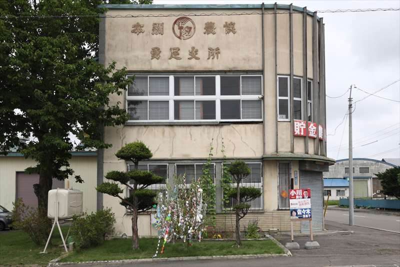 なんと美しい建物か。まるで日通の事務所のように、パラペット(と呼んでいいのだろうか)に「マル協」、それを囲むように「本別農協」。コーナーはラウンドを描き、まるでキハ07のように極縦長の窓が曲面に沿って8組はめこまれている。