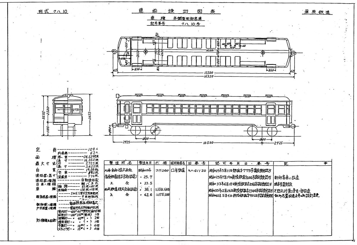 蒲原鉄道 ED1 形式図(車両竣功図表)の続き。 記載事項を転記する。粍をmmに、米をmに、屯をtに置き換えた。 形式クハ10 車両竣功図表 車種 半鋼製制御客車 記号番号 クハ10 定員…109人 内座席…62人 面積 客室 34.55平方m 最大寸法 長サ…16350mm : 巾…2725mm : 高サ…3655mm 自重…19.00t 連結器ノ高サ 空車…890mm : 満載車…770mm 連結器ノ種類…自動連結器 台車ノ種類…軸バネ式 車軸 軸頚…85mm×182mm : 車輪座…128mm×178mm 制動装置ノ種類…SME三管式空気制動機 : …手用制動機 : …(記載抹消) 制御器ノ種類…電磁空気単位接触器式 戸閉装置ノ種類…電磁空気式半自動戸閉機 灯ノ種類及ビ個数 室内灯…600V40W(蛍光灯)直列8個 : 全消灯…100V200W(電球) 1個 : 標識灯…100V40W(電球) 2個 : 運転室灯…100V40W(電球) 1個 : 予備灯…100V10W(電球) 4個 : ステップ灯…100V15W(電球) 4個 製造所名 川崎車両株式会社 製造年月 昭和10年 代価 719260 前所有者名 国有鉄道 旧番号 キハ41120 認可年月日 昭和25年5月11日鉄監第775号譲受使用認可(注:第=略字) 記事 製造所名 蒲原鉄道株式会社(改造) 製造年月 昭和25.7 代価 前所有者名 旧番号 認可年月日 昭和25年7月19日新陸鉄業第646号設計変更認可 記事 制御客車に改造 製造所名 上仝 (注:蒲原鉄道株式会社(改造)) 製造年月 昭和33.5 代価 前所有者名 旧番号 認可年月日 昭和33年4月18日新陸鉄監第2066号設計変更認可 記事 暖房装置新設 製造所名 西武鉄道株式会社(改造) 製造年月 昭和38.1 代価 1650600 前所有者名 旧番号 認可年月日 昭和35年12月26日新陸鉄監第2504号設計変更認可 記事 不燃化対策工事及一部改造 製造所名 上仝(注:西武鉄道株式会社(改造)) 製造年月 昭和42.6 代価 1475000 前所有者名 旧番号 認可年月日 昭和42年5月4日新陸鉄監第9025号設計変更認可 記事 制御装置改造及其の他設計変更 キハ41120の国鉄最終配置は大館であった。 1930年に製造された車両が、蒲原鉄道最末期まで使用されていたのは奇跡というべきか。キハ41000(キハ04)最後の生き残りだった(注)。1956年の写真が『キハ41000とその一族(下)』に掲載されており、それによれば気動車時代の名残が、孔として床下にあるということだ。ただし、見てもおそらくそれがそれであるとわからないだろう。 (注)片上鉄道にて動態保存されている車両がある。 PR |