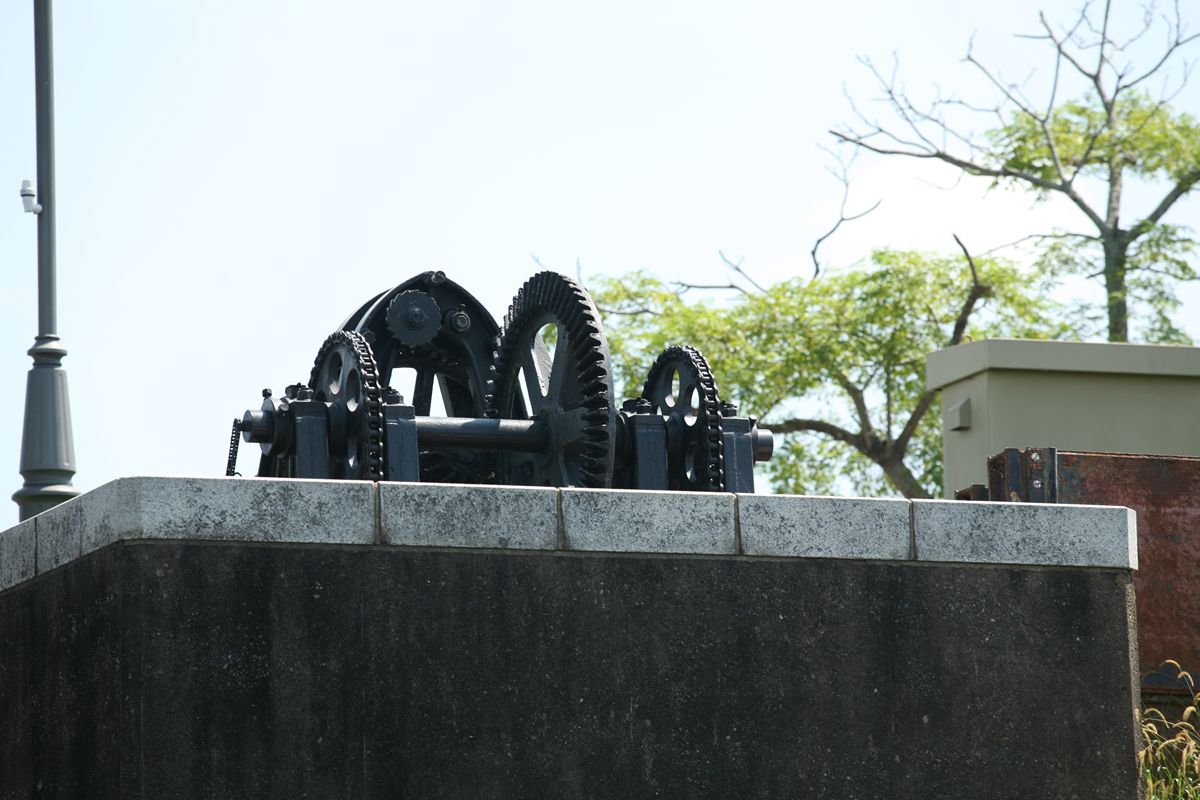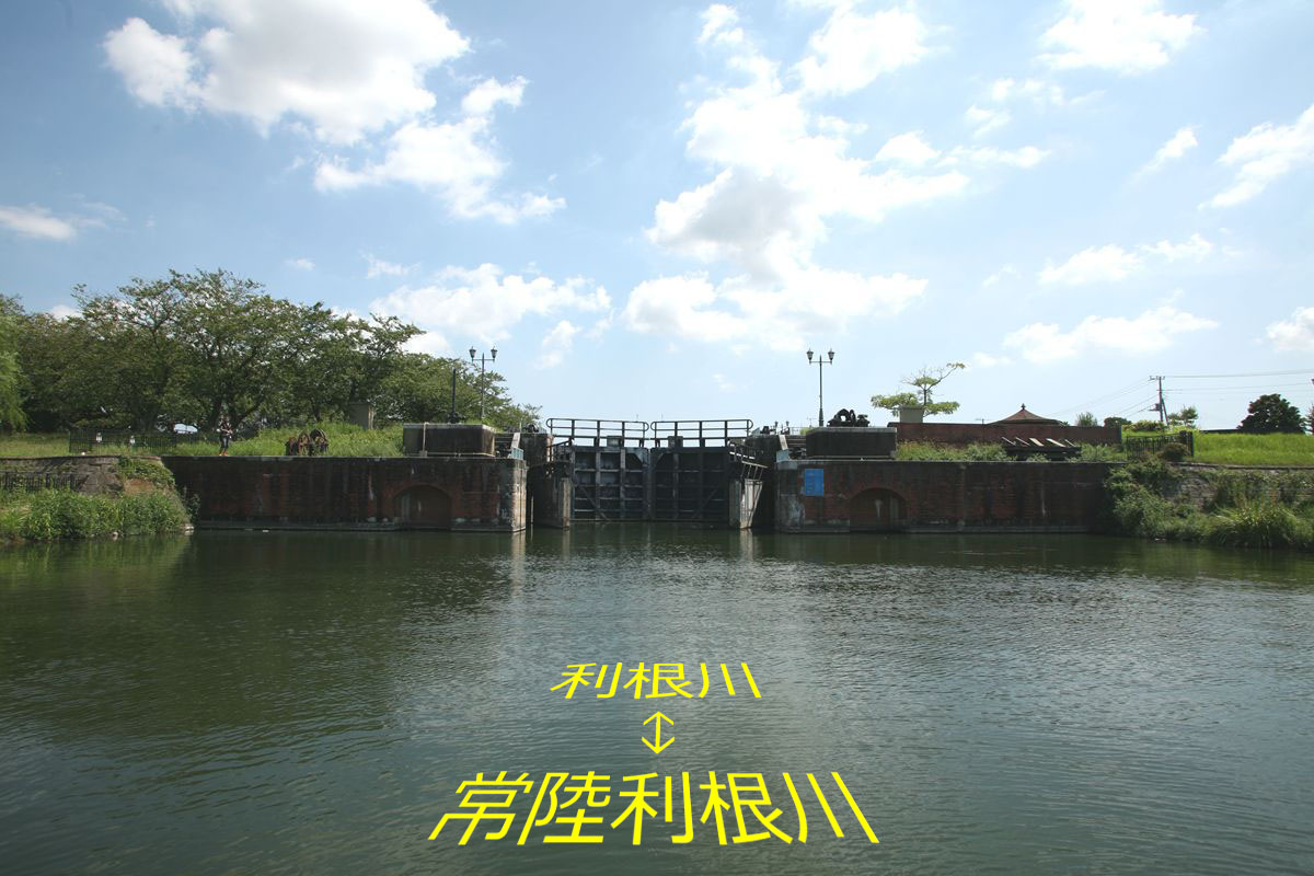 水路を行くのは初めてなので、閘門の中を行くのも初めて。ルートにはいろいろな閘門が組み込まれていたが、もっとも気になったのがこの横利根閘門だ。常陸利根川(北側)から利根川(南側)に向かって進む いや、この閘門が気になったのは、他の閘門と異なり、 (謎1)観音扉のゲートだったこと (謎2)通常、閘門を挟んでゲートは1組なのだが、それが2重、すなわち4つのゲートがあっていたこと (謎3)ゲートはそれぞれ対になり、菱形をしていたこと (謎4)それぞれのゲートの高さが異なること (謎5)ゲート先端に木材が打ち付けてあること というように、やたら特殊な感じがしたのだ。門扉がこちらに突き出しているのがわかるだろうか。 位置の紹介がてら、航空写真で見てみると、その意味がわかるだろう。 「2組の菱形」の存在がわかるだろうか。左上が常陸利根川方面、右下が利根川方面である。便宜上、左上常陸利根川方から「1番ゲート」「2番ゲート」…とする。 船を近づけ、1番ゲート開扉。 向かって右側の上にあるでかい歯車が動いている。 雨ざらしでこれが回っていることに感動する。注油も大変なんじゃないか。 ここが自動化されたのが何年、だとかいう記述をどこかで見たが、それまでは向かって左の歯車を手でキリキリ回していたのだろうか。 1番ゲート全開。 向こうに見える2番ゲートが、向こうに向かって突き出しているのがわかるだろうか。 進む。 2番ゲートの先端部(画面では右側)は木製である。これが謎だった(後述)。 また、画面右側に奥行きのある窪みはなんだろう。この下部から注排水するのではないかと思う(まったくの憶測です)。 ここで、4枚のゲートのうえ、2番・。3番、すなわち利根川方のゲートのほうが高さがあることに気づいた。 文字で書くとこんな感じ。 (利根川)≪> ≪>(常陸利根川)