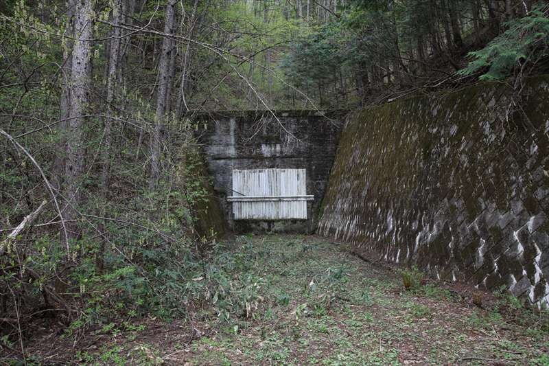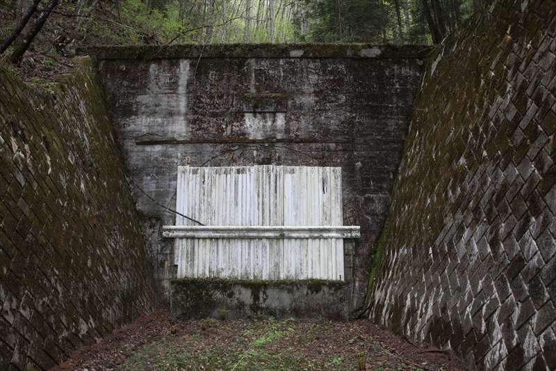 反対の西側。 少し堀割を作り、その奥に坑門を配している。こちらは完全に塞がれている。 廃ガードレールを利用した蓋だ。縦に15本並べ、それを水平に帯状にガードレールで留めている。下部はコンクリートのブロックを築いている。 こちらにも扁額はあり、「折橋隧道」とあるかに見える。しかし「隧」の文字部分は苔に覆われて見えない。その下には「開田口」とある。そして、これまた苔で見えないが、おそらく増田甲子七の名前が右下にあるようだ。 2013年9月17日追記: 「墜」「隧」について、平沼義之さんから興味深い資料をいただいた。明治時代の漢和辞典に「隧(ツイ、ズイ)」を「隧(スイ、ズイ。同じ漢字)」と分けて項目を立てた上で「墜と同じ」と書いてあるという。ツイートをソースごと転載すると無関係のツイートも表示されてしまうので、テキストのみを転載する。 (1) 対して、私が誤字だと考える根拠は、回答としては成り立たないかもしれないのだが、「漢字の使われた方に関する考え方」を根拠としている。 漢字は、音が通じると平気で誤用されてしまう。個人的に身近なところでは、「磯部」の「磯(日本では海の磯)」、これをまったく意味が異なる「礎」「礒(川にある石)」で代用されることがある。異体字も同様に有名ならともかく、「本来の意味」を持つ漢字があり、それが圧倒的に有名な場合は、私は異体字(代用字)は誤り、と考えている。いくら「斎藤さん」が「斉藤さん」と誤記されようと、両者の漢字はまったく異なるものなのである。もっとも、漢字は読み方も形もどんどん変化するものであることは重々承知の上で、書いている。 逆説的な「誤記説」の補強としては、扁額が誤記でないなら修正する必要はない、ということもある。真相は不明である。 こうしたことは「正しい/誤り」という話ではなく、その変化の度合いを把握することが大切なのではないかと認識を新たにした。平沼さん、ありがとうございました。 PR |