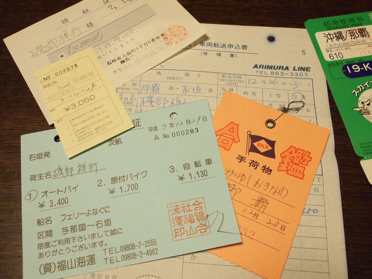 切符類。波照間のフェリーは、こんな領収証を手書きしていた。要求したわけではない。
