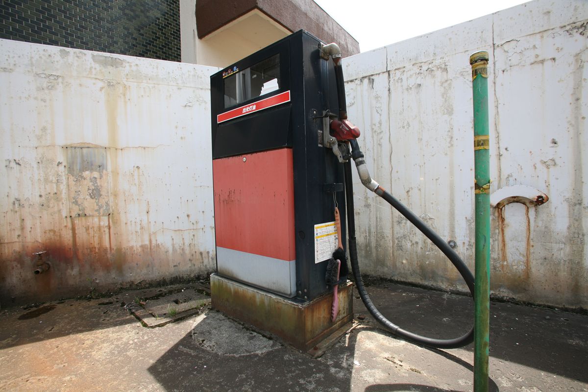 出光の「光」に重なっているのは計量器だろうか。確認するには、少しためらわれた。他人の敷地であることがわかるからである。その左、計量器乗っていたとおぼしき場所は、すでにゴミ置き場と化していた。 それにしてもこの狭さ。一般向けではないと思うし、どういう商売だったのだろう? |