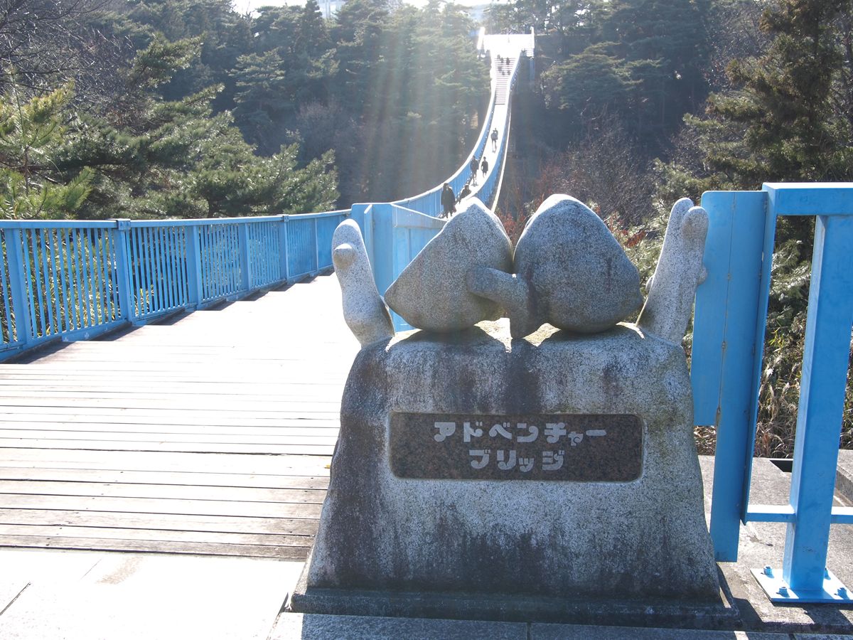 宇都宮に友人たちと餃子を食べに出かけた折、腹ごなしに八幡山公園まで歩いた。そこに「アドベンチャーブリッジ」「アドベンチャーU」なる、そこはかとなく興味が引かれる名称が案内標識に記載されていた。どうやら吊橋らしいのだが、行ってみて驚いた。主索で床版を吊る通常の吊橋ではなく、主索に直接床版を載せる
