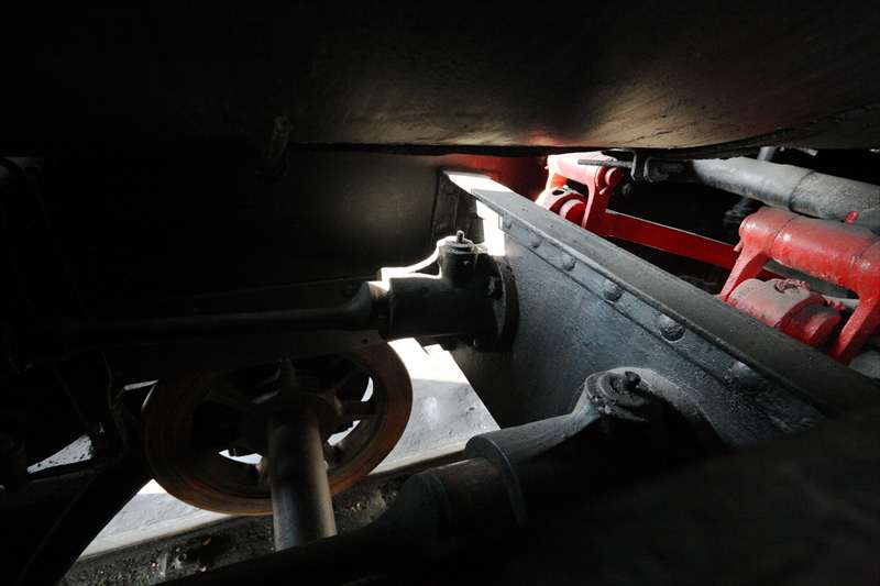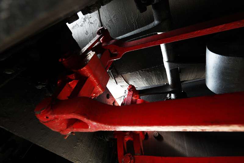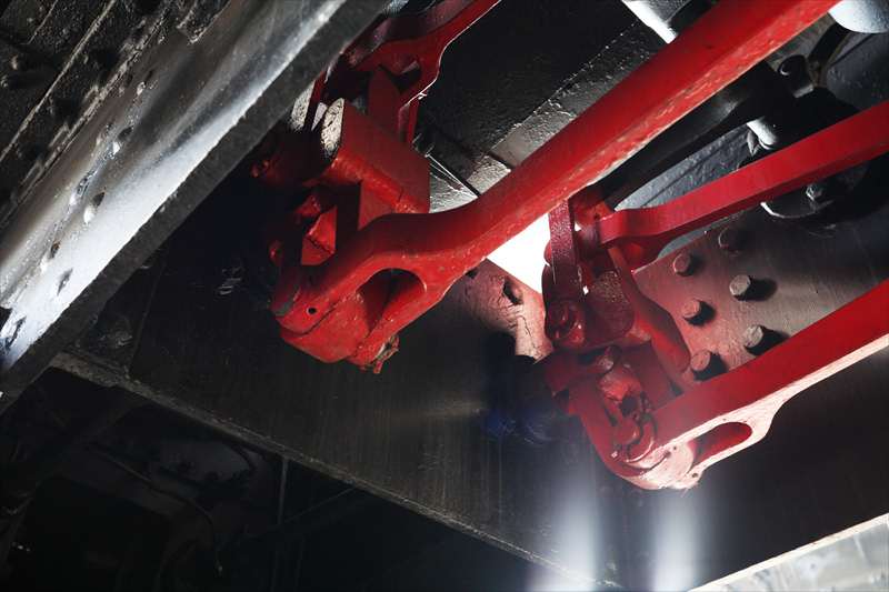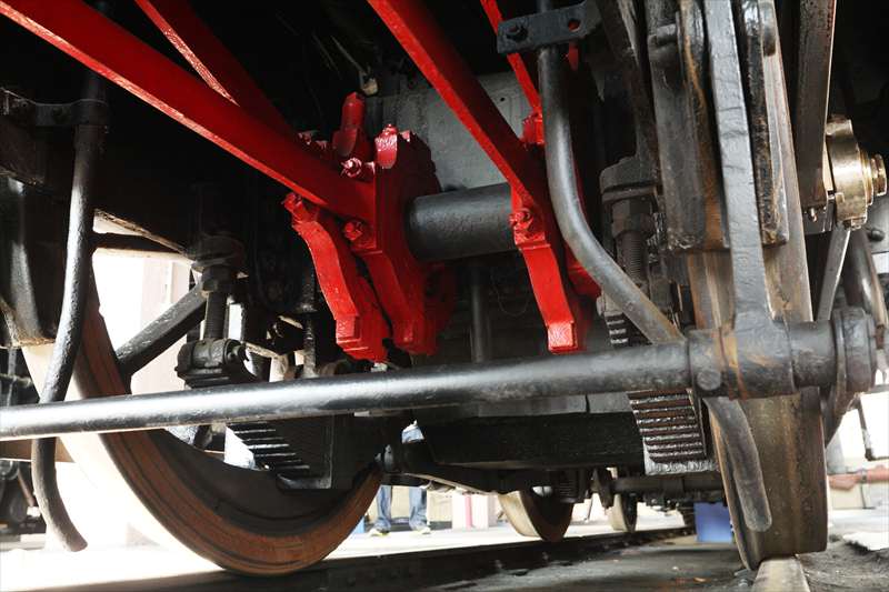 車輪の下にローラーがあり、それが回転することによって車輪を動かしている。動輪に連動してロッド、ピストンと動き、さらには弁装置まで動いている。ピストンが動いているのは、シュコンシュコンという空気が圧縮された後に抜ける、というような音でわかる。 こちらがスチーブンソン式弁装置のキモたる部分。加減リンクから左、ピストン弁を駆動する棒(バルブスピンドル)があるのだが、その位置を見ると中立になっていた。考えて見れば当たり前のことだった。