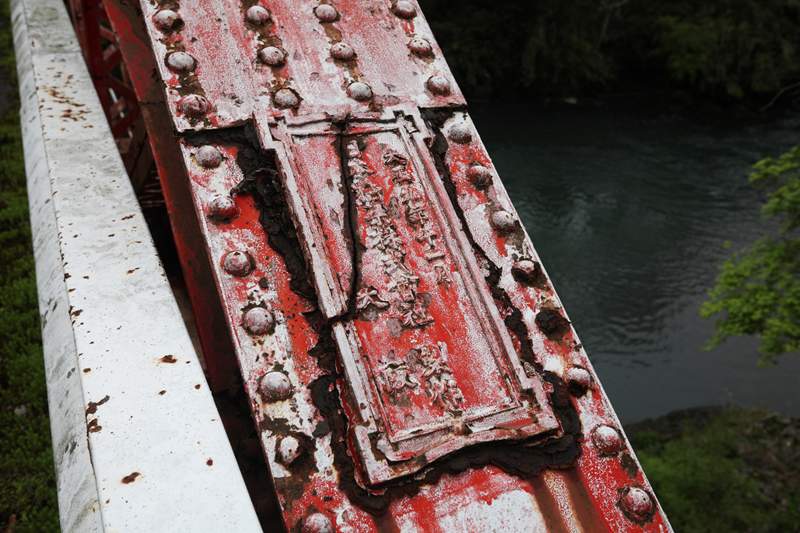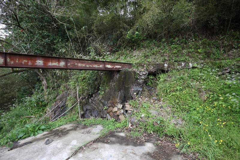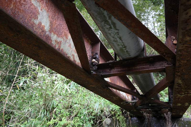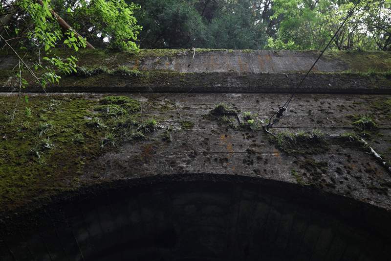 隧道内、腰の位置には金属の帯がある。そして、坑門から1~2mのところは隧道内部を円周方向に鉄板で補強している。これはおそらく、地山の重みで坑門が前(道路側)にせり出し、その煽りで坑門から1~2m付近で円柱方向に亀裂が生じたのを補修したものだろう。