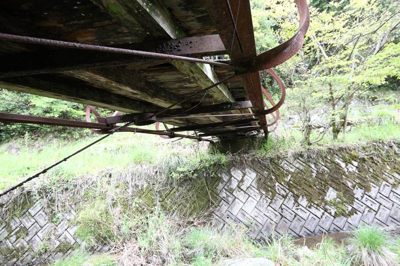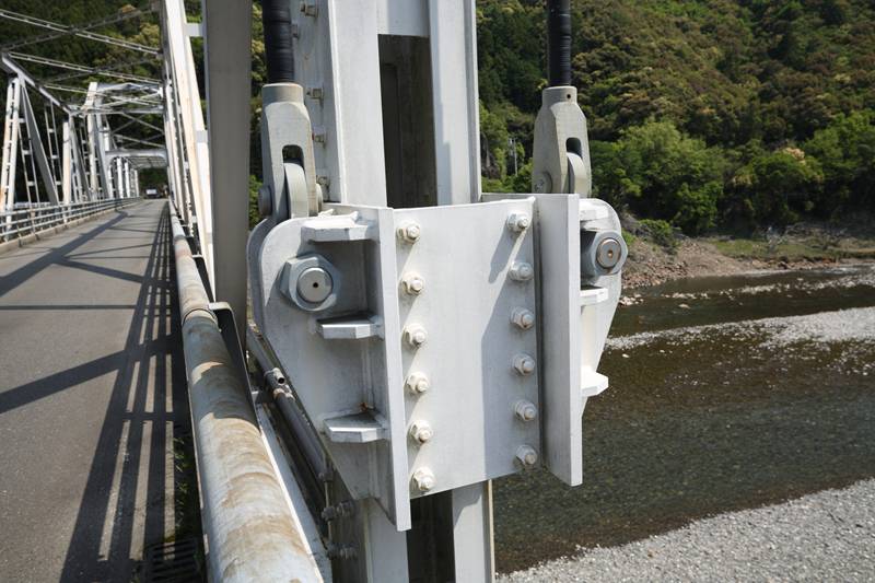 吊桁との接合部を見る。道路に継ぎ目がある部分の両脇の垂直材から右が吊桁。