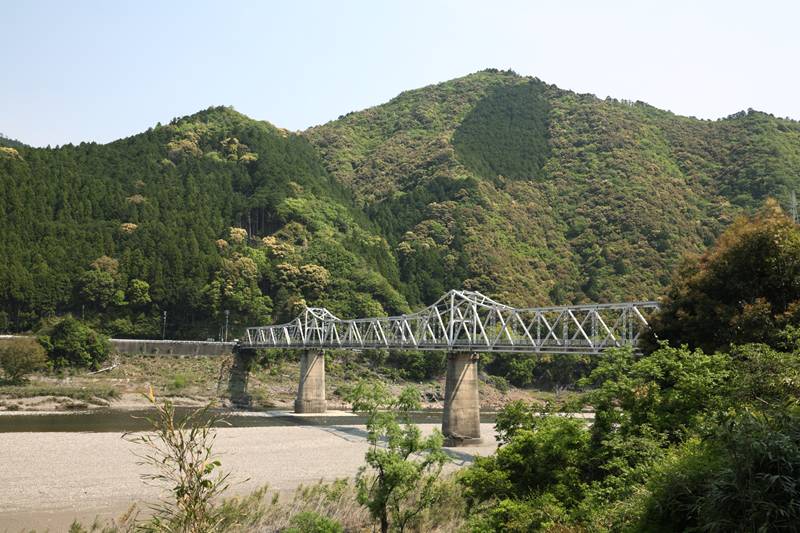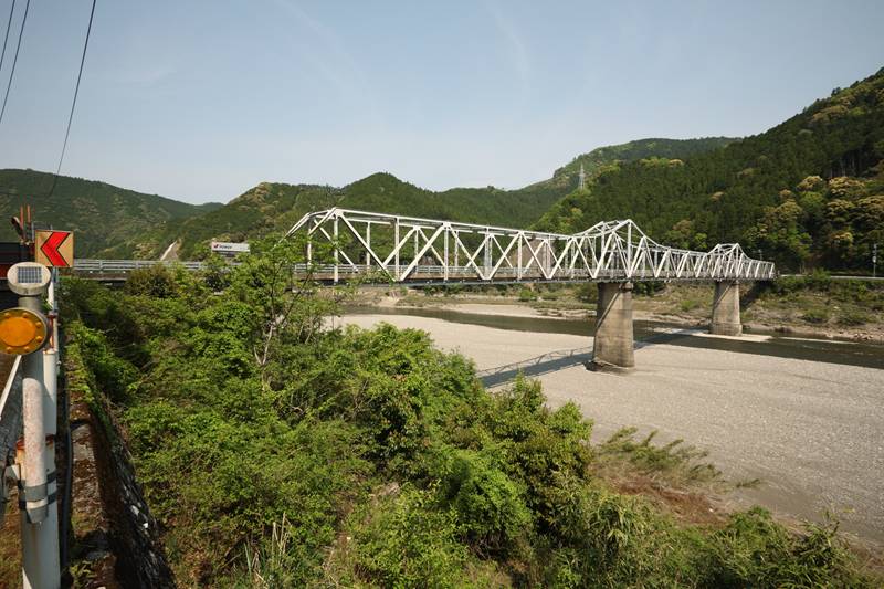 紀伊半島西部、御坊市の日高川にかかる国道42号の橋梁。流路をカンチレバートラスで、河川敷部分は北側を1スパン、南側を3スパンのポニートラスで跨いでいる。上の写真は西側(河口側)から。上流側には歩道がつけられている。
