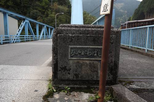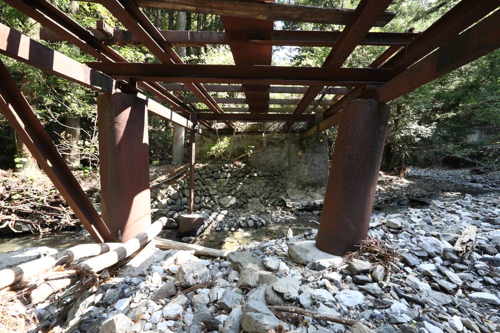 橋台を見ると、河原の石を積んだ部分とコンクリートの部分がある。おそらくコンクリートは後年の補修。そして、そのコンクリートの中には腐った木材が見えていた。この付近の川の流れは何度か変わったようで、橋台や周辺の土木構造物は破壊されていた。