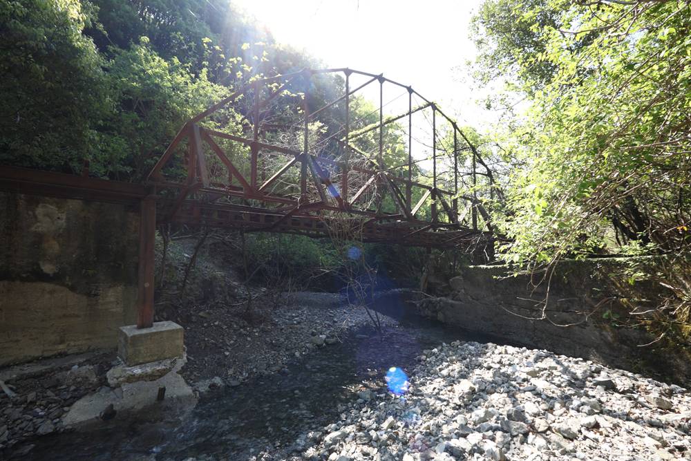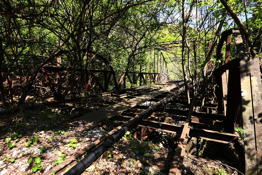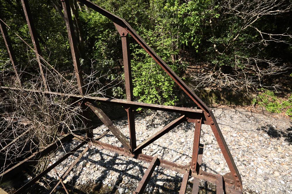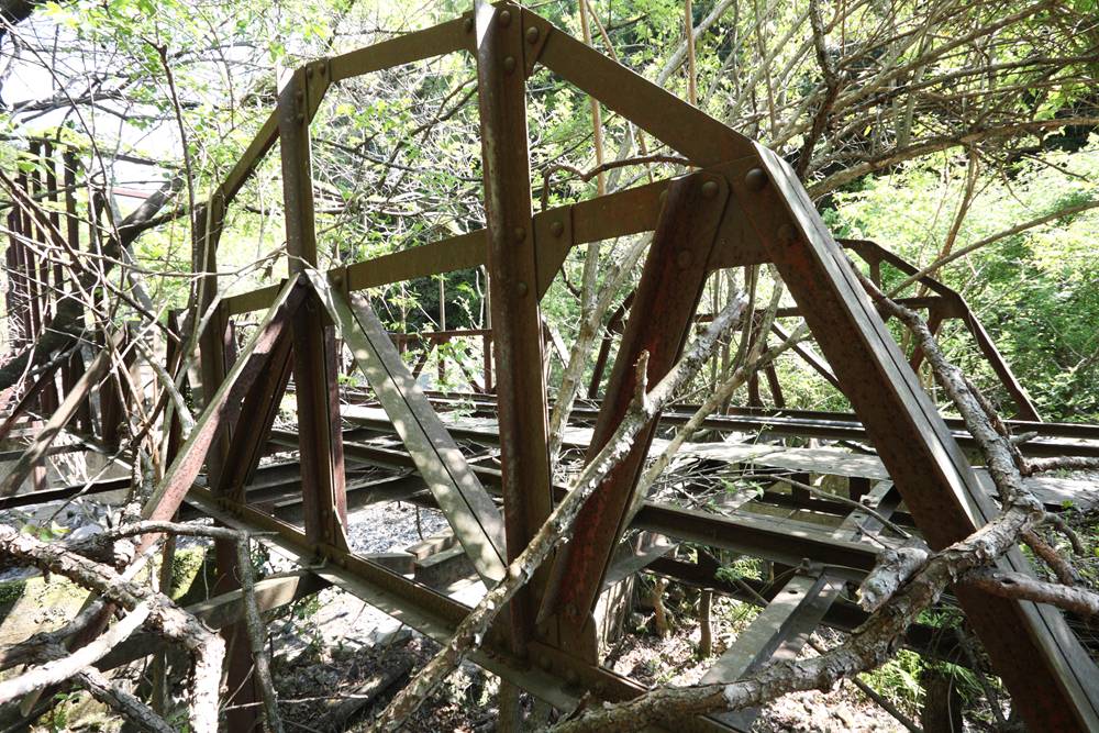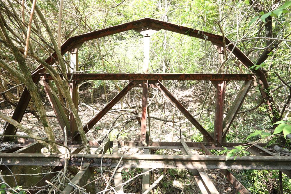 桁は、軌間610mmの中部軌道にあり、複線のうち片側が撤去されている。左右のランガートラスはアーチ上部で結合されているが、構造部材ではなく、倒れ込みを防止する程度のものに見える。