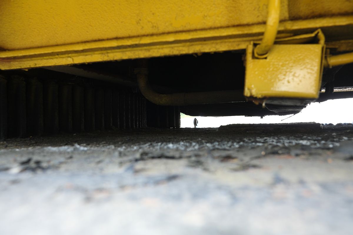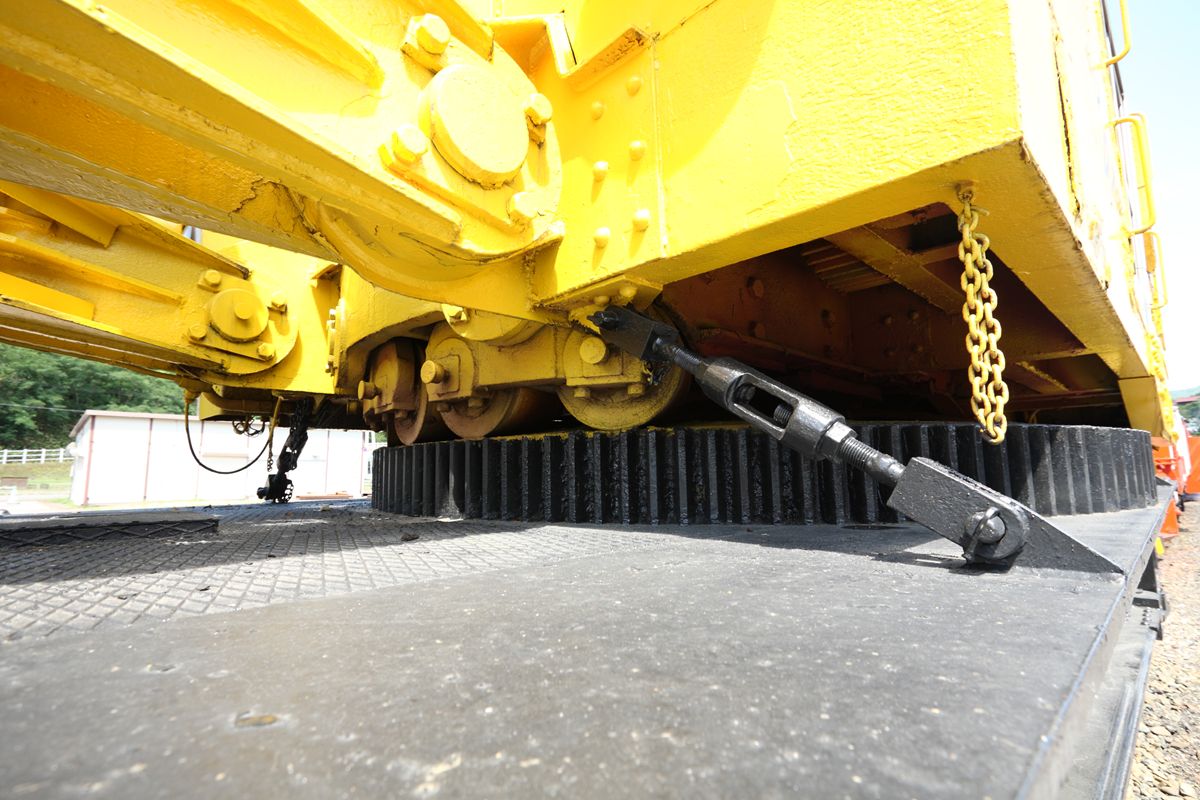 写真左が前。いちばん前の第1動輪にはブレーキがなく、第2から第5動輪にのみブレーキシューがある(D)。それぞれ、ブレーキシューの支持棒の長さや固定方法には差がある。また、ブレーキロッドも各動軸間の長さの棒が連結されており、要所にターンバックルがあって引きしろを調整できるようになっている。