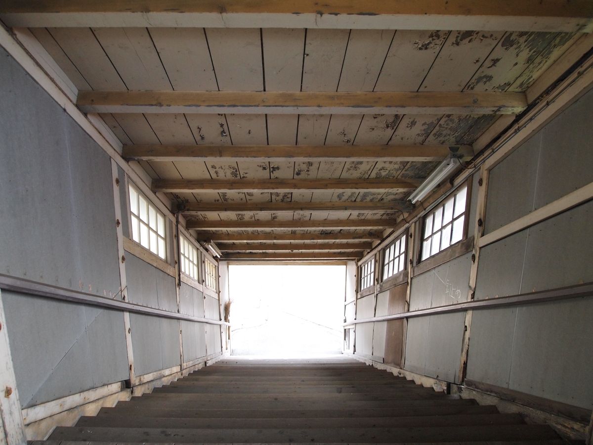上りホームの階段。柱と梁も木製のままだが、色を塗っている。屋根はトタンに張り替え。