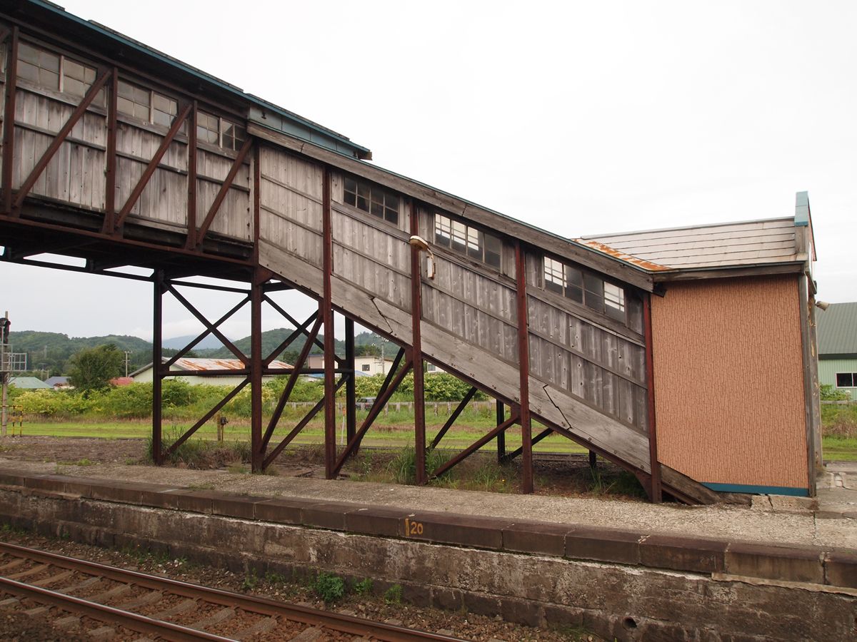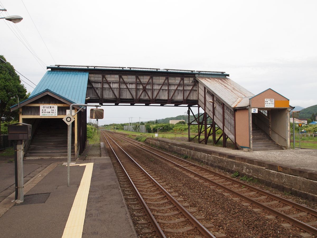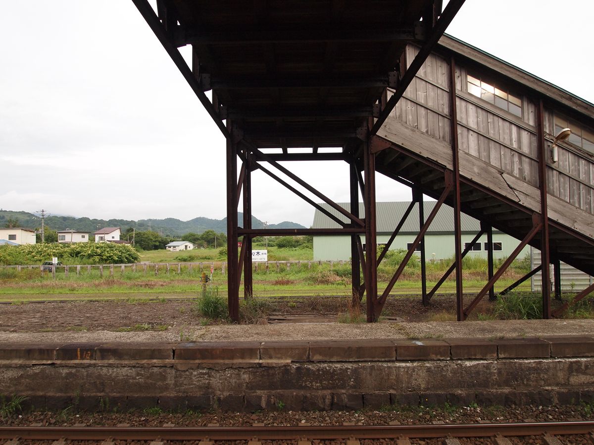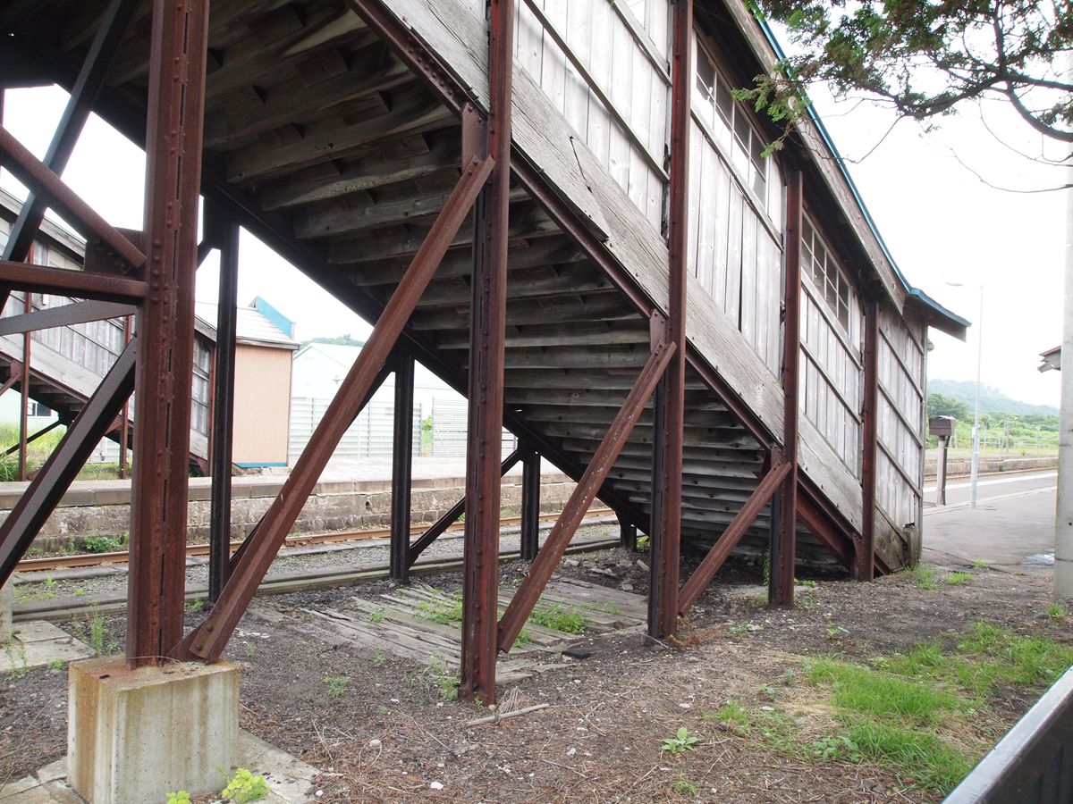 一晩中、貨物列車が通る。その度に地面が揺れるというすばらしい環境。夜のうちに、跨線橋が古レールのプラットトラス+木造であることはわかっていたが、夜が明けてから撮影した。画像奥が函館豊年、左が上りホームで駅舎側、右が下りホームである。それぞれ、階段部分が改修されている。