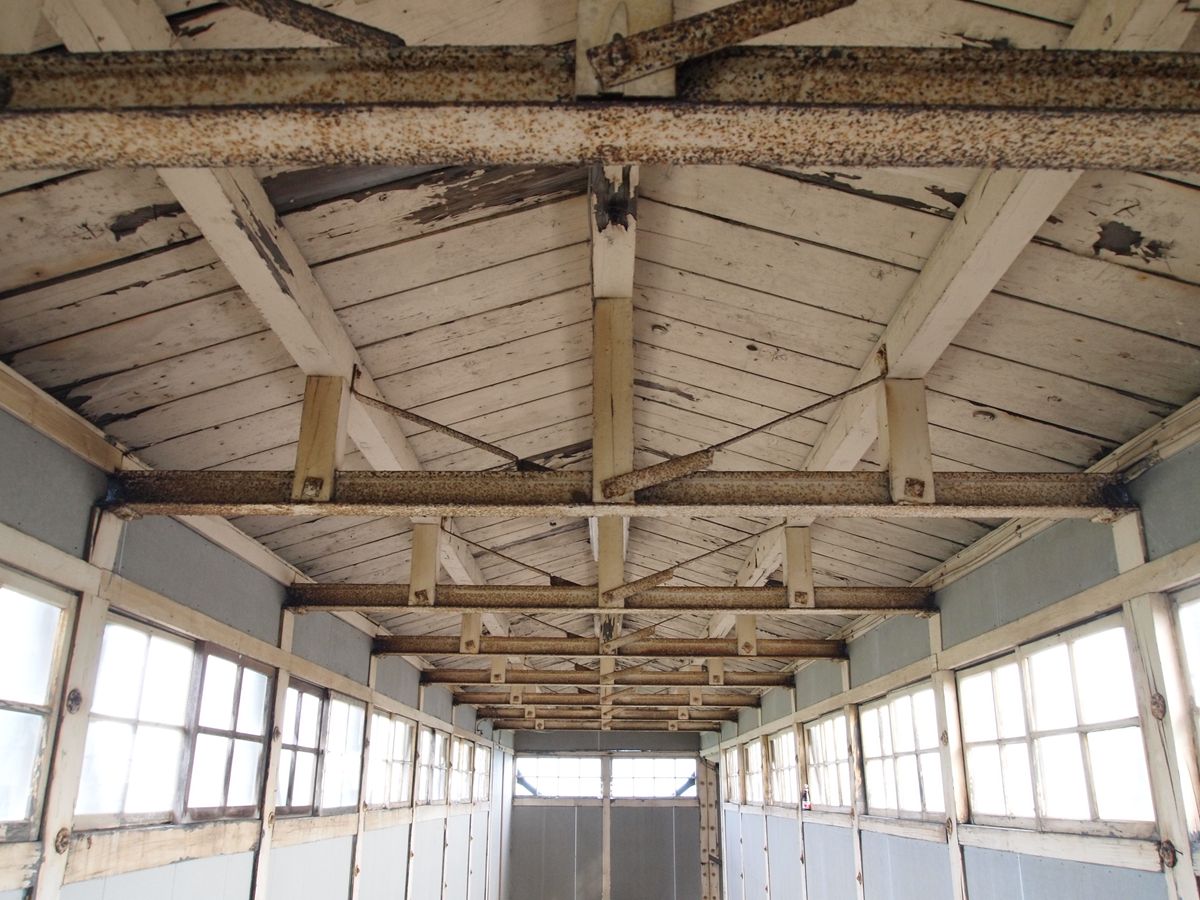屋根方向を見ると、やはり横桁は古レールで、そこに木材で真束を立て、鉄材でトラスを入れている。