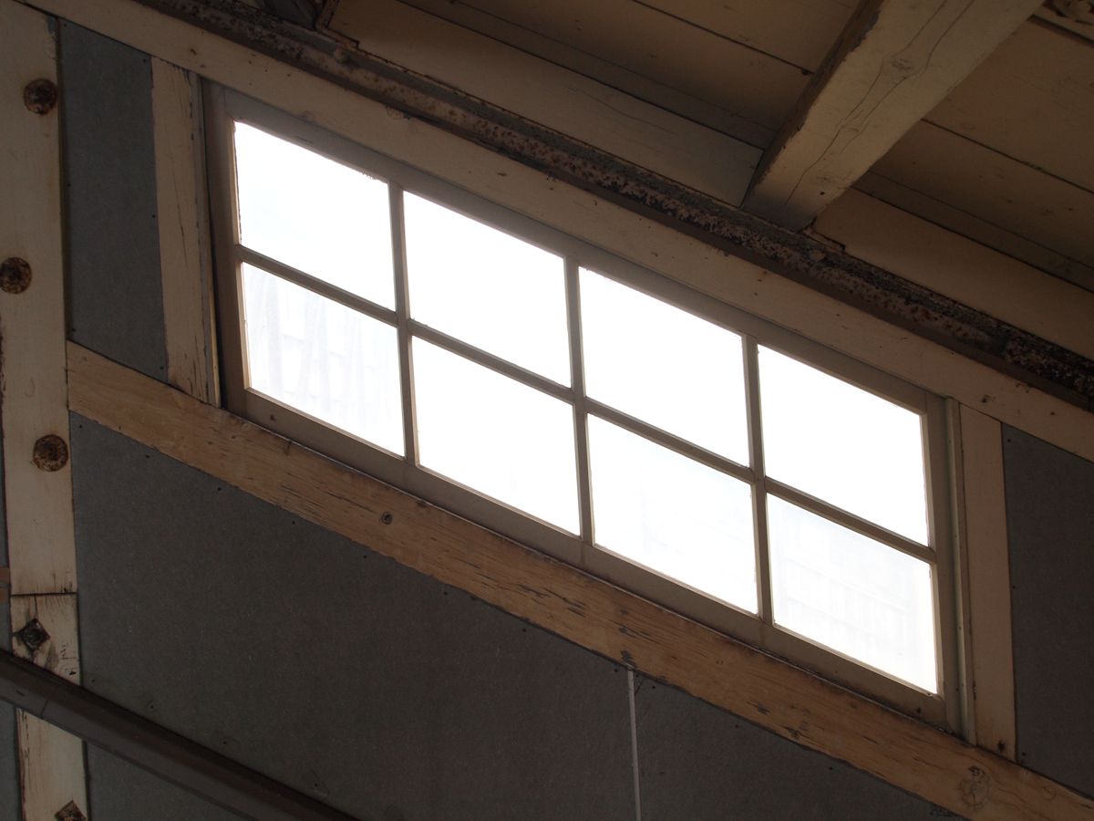 素敵なのは、この窓。平行四辺形の窓枠と、窓。桟は木製、はめ殺し。