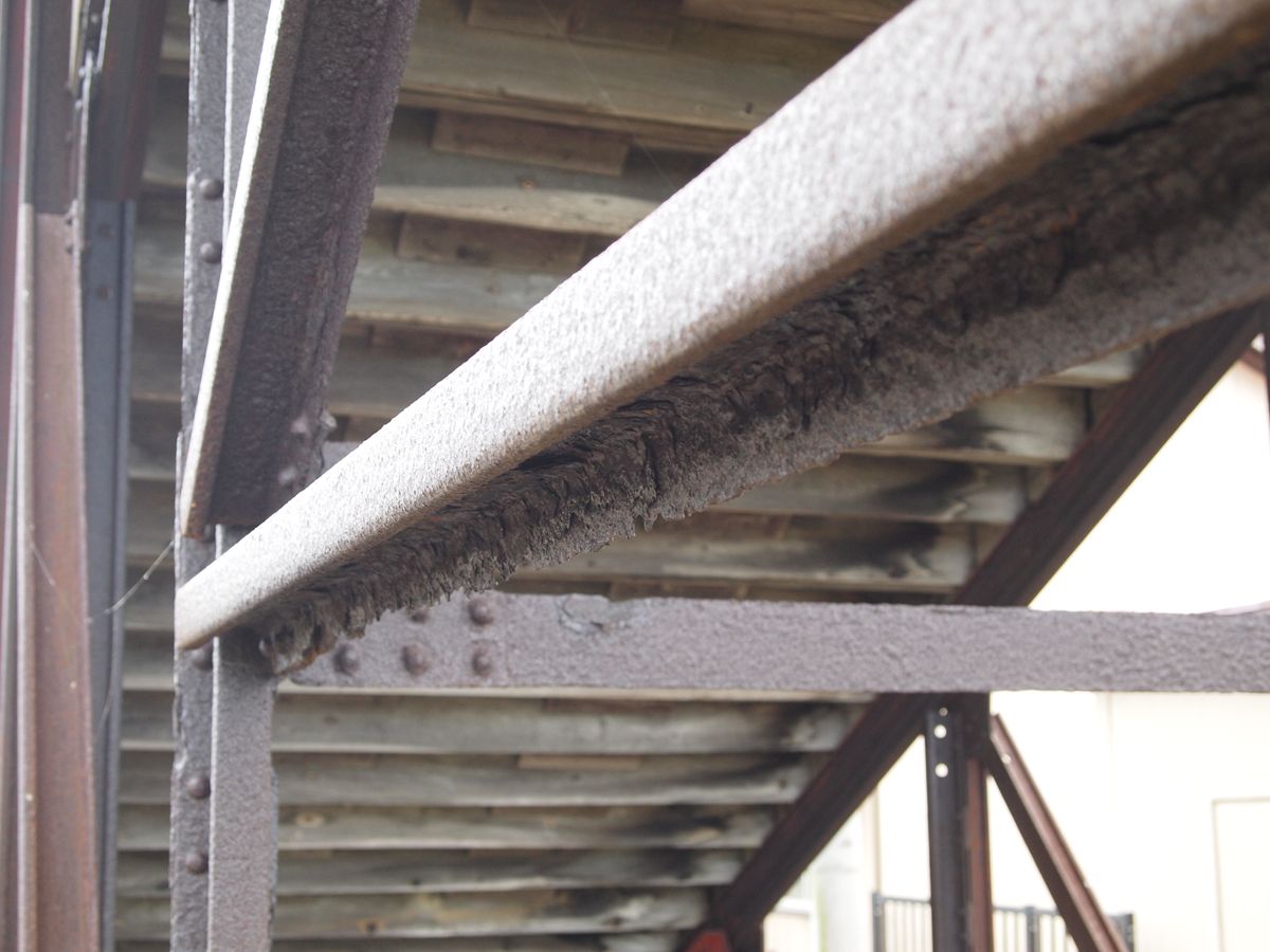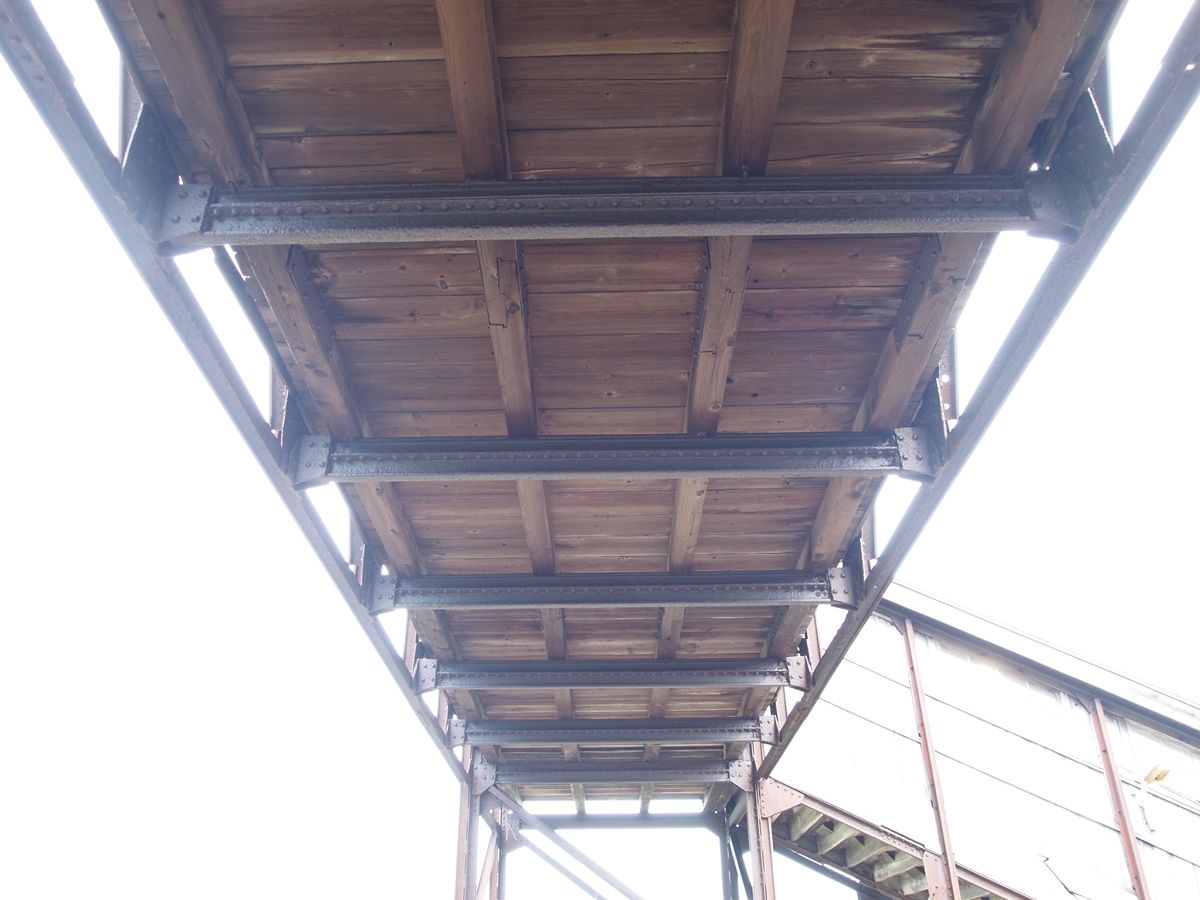 跨線部分。柱のところどころにボルトが見えるのは、プラットトラスに組まれた古レールのフレームとの接合のためだろう。