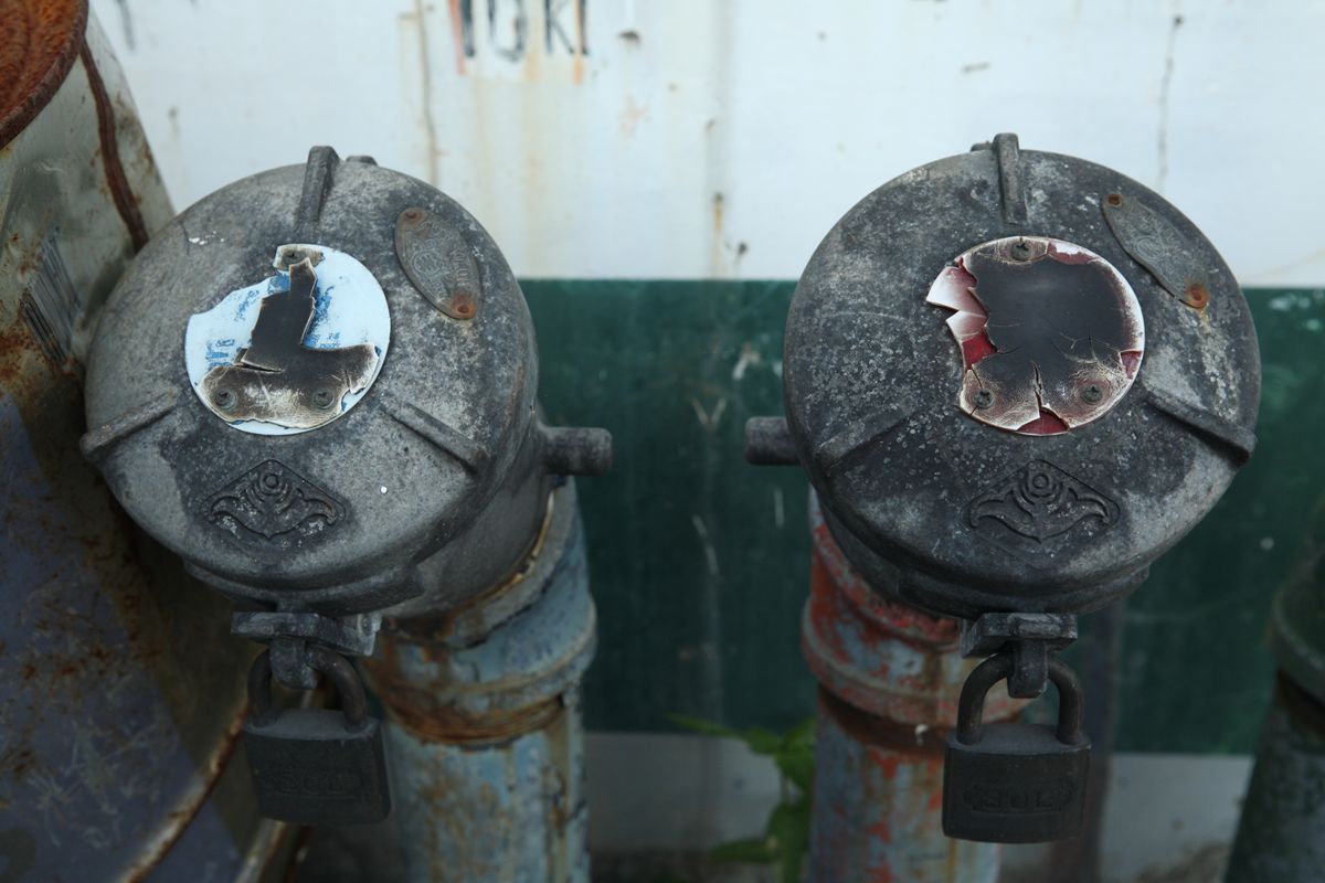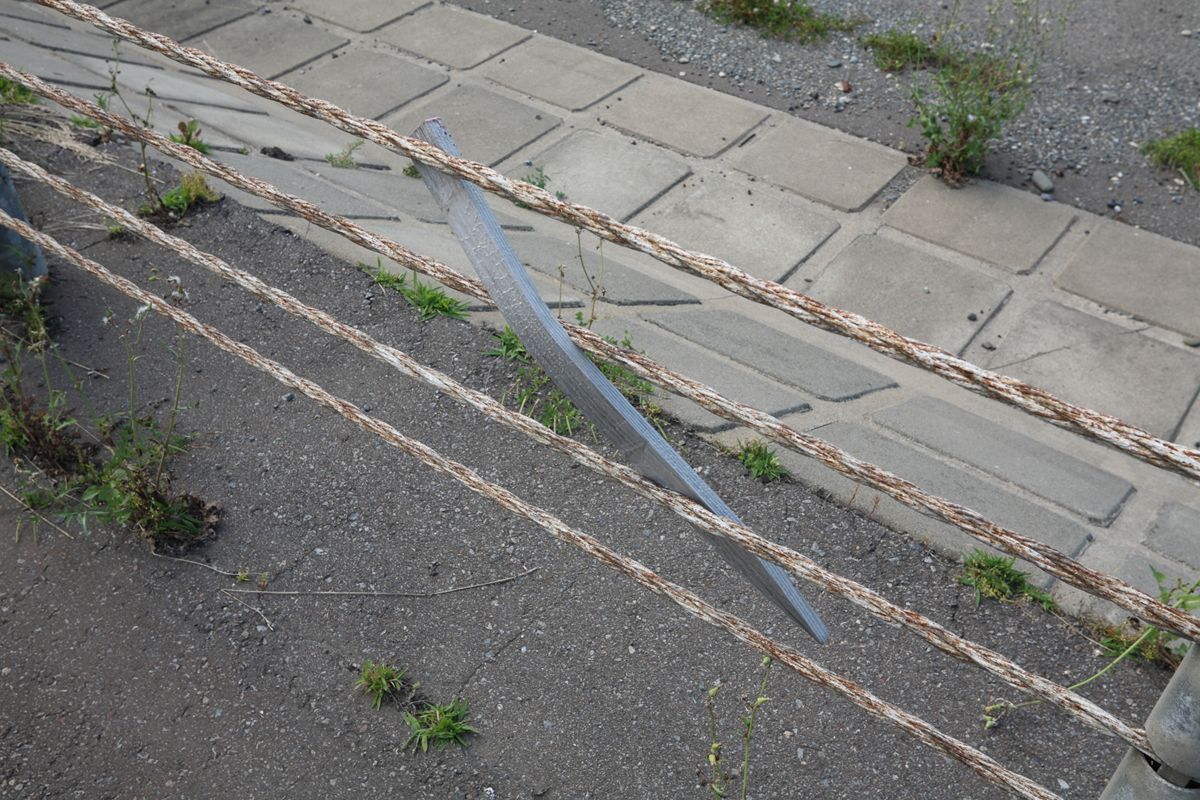 調布12号踏切(切り替え後も残る)より、調布方向を見る。以下推測。土嚢が積んである部分が縦の緩和曲線、その向こうから33パーミルくらいで下ってくのだろう。鉄骨で組まれた覆いは、架線の高さ変更に応急的に対応させるためのものか。