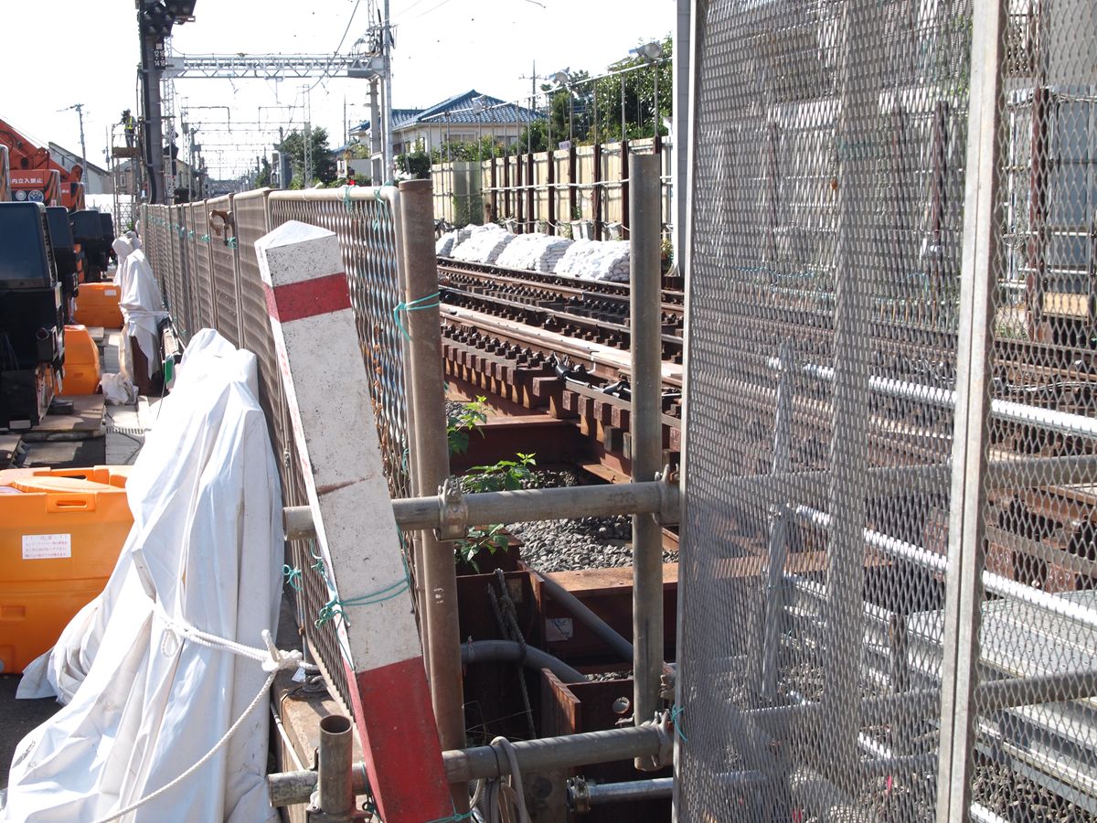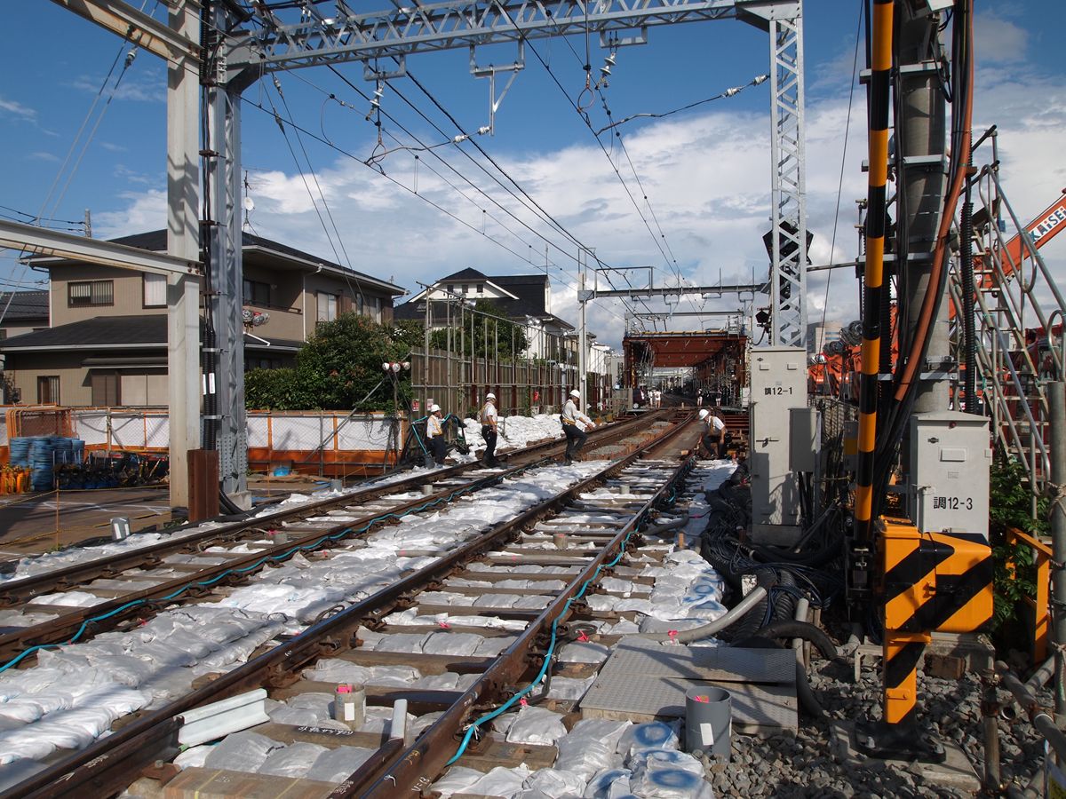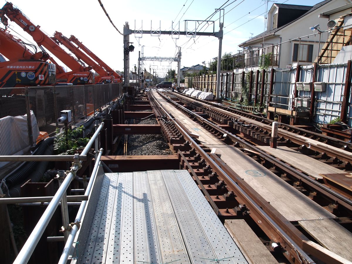 調布駅を地下化するため、調布の前後3ヶ所で、地上から地下への切り替え工事がある。こうした工事では、新線部分を完全に脇に作って置いて、切り替え当日には旧線のレールを新線のレールにつなぎ替えるような形でする…つまりレールの平行移動だと思っていたのだが、今回の場合は、現状の線路の真下に複線を敷いておき、当日、レールを垂直方向に移動して新線とつなげる工法である。