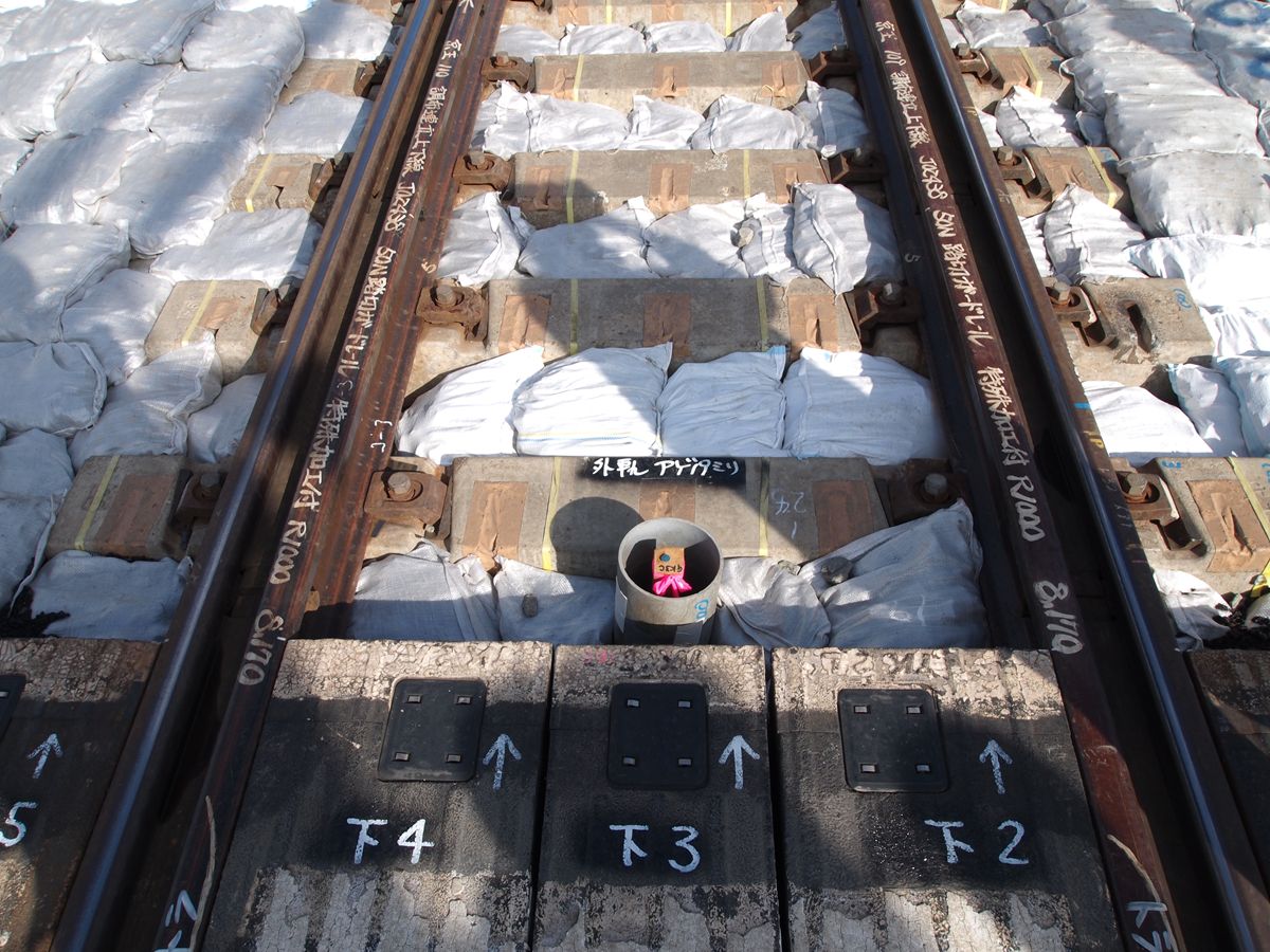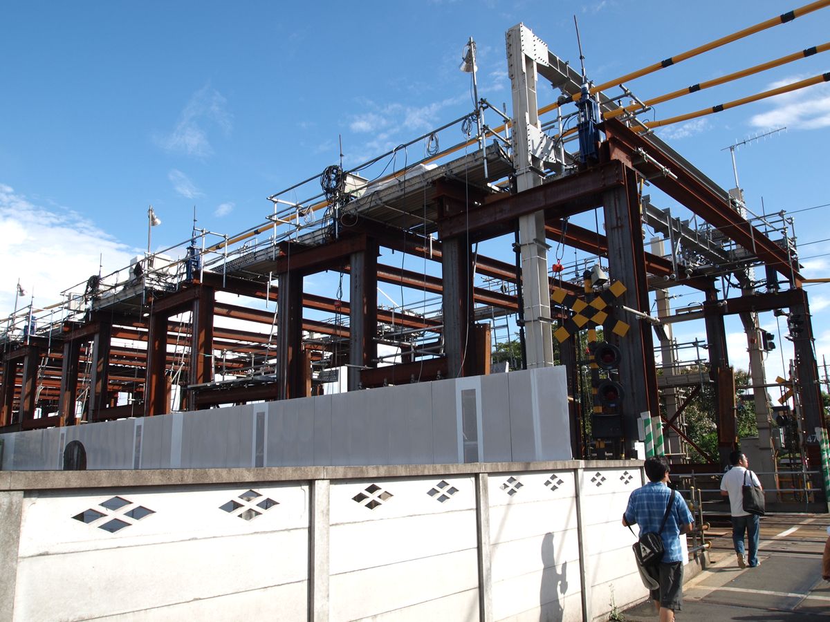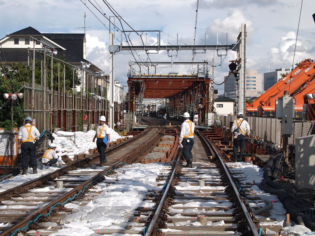 調布駅を地下化するため、調布の前後3ヶ所で、地上から地下への切り替え工事がある。こうした工事では、新線部分を完全に脇に作って置いて、切り替え当日には旧線のレールを新線のレールにつなぎ替えるような形でする…つまりレールの平行移動だと思っていたのだが、今回の場合は、現状の線路の真下に複線を敷いておき、当日、レールを垂直方向に移動して新線とつなげる工法である。