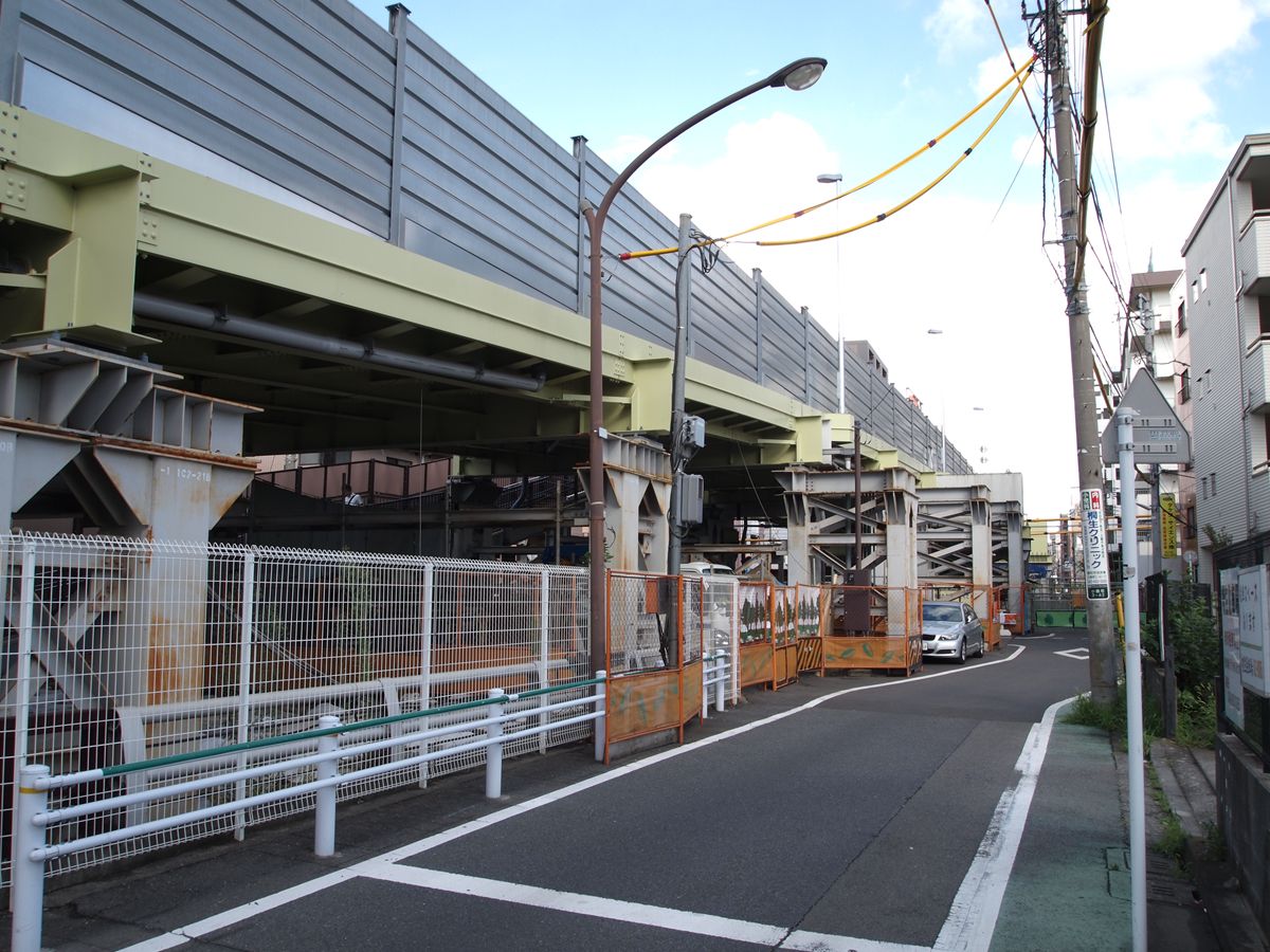 ここまで来ると、現在の路線の下に、新線がハッキリと見える。つまり、現在の路線は、すでに橋桁の上に乗っているような状態なのだ。これは冒頭からの流れと同じく新宿方向を見ている。