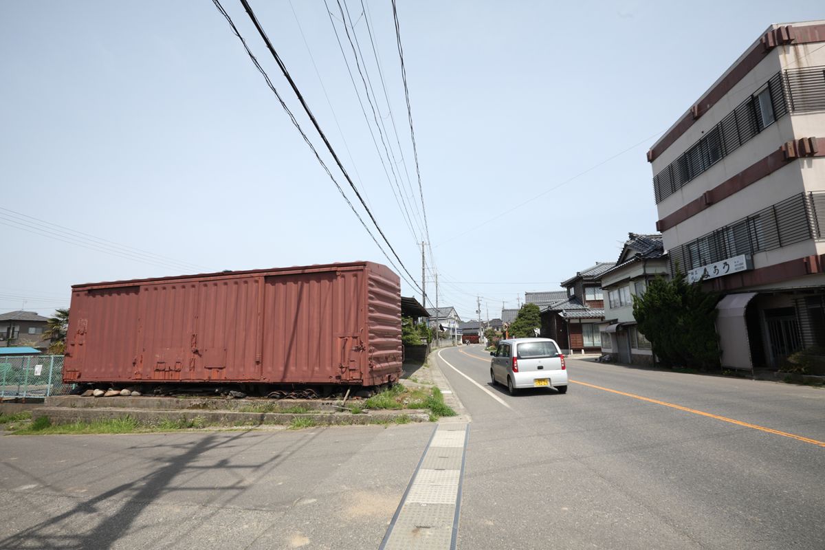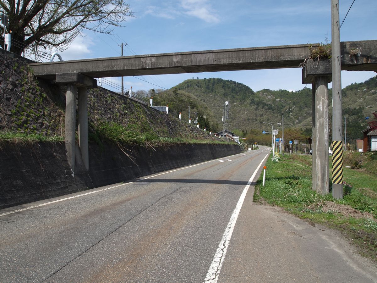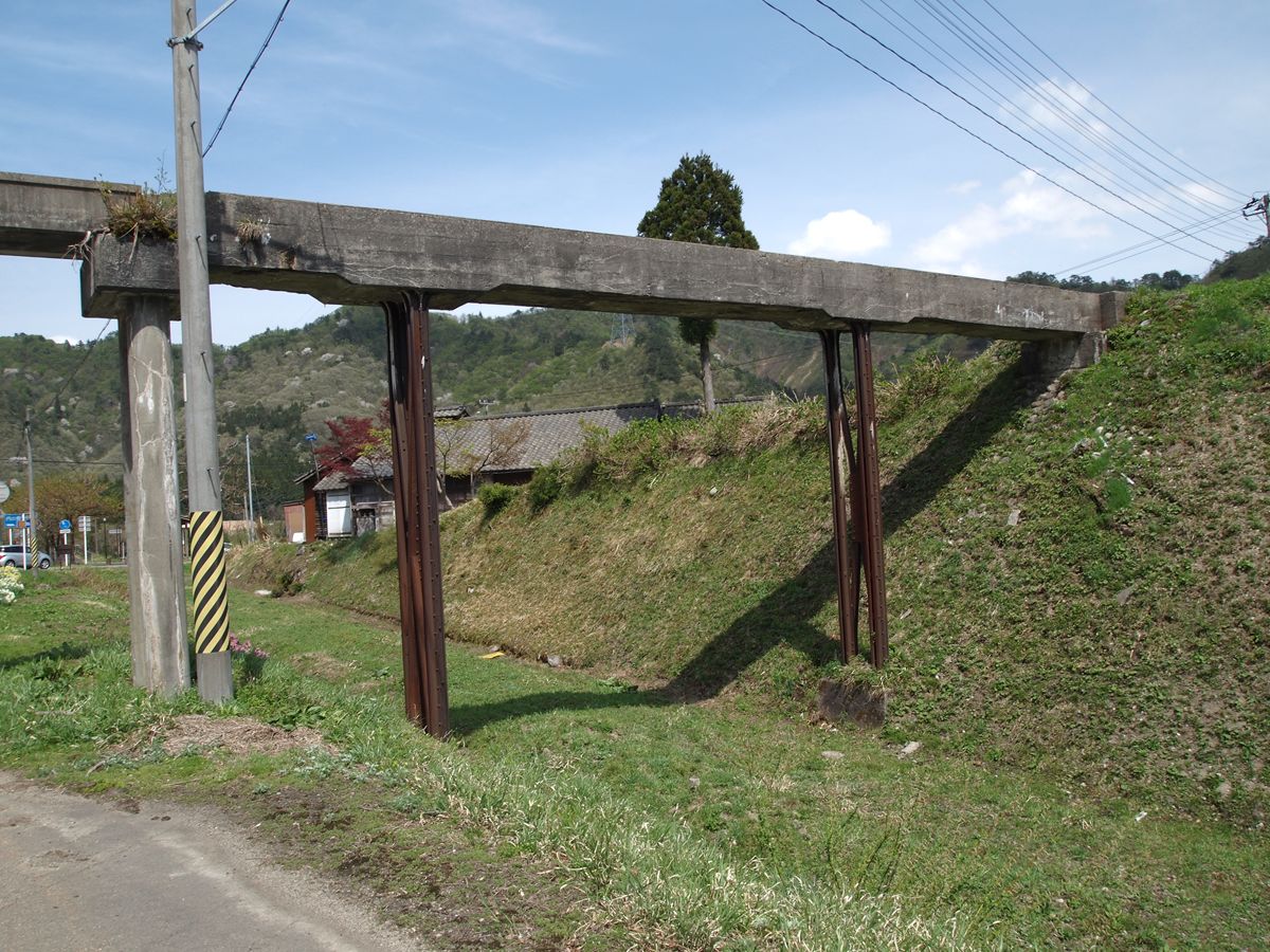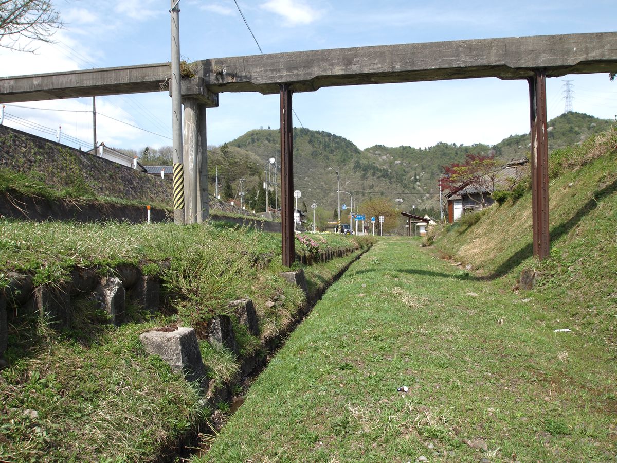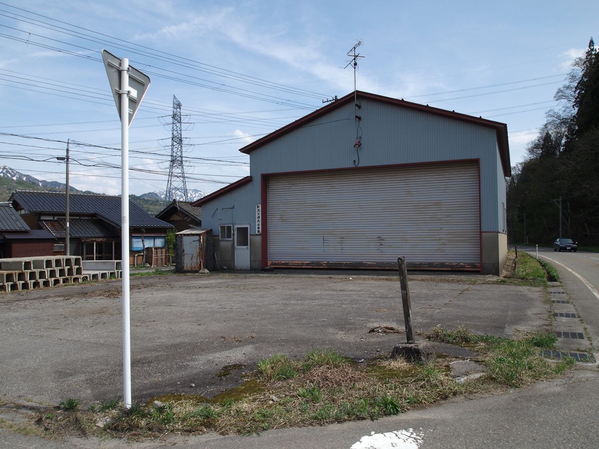 与板の街中には、いまだ越後交通の廃線跡が堂々と残っている。ホーム跡も容易にわかる。関係建築物を解体したものと思しき残骸もある。更地化したところは、運送会社の駐車場になっている。