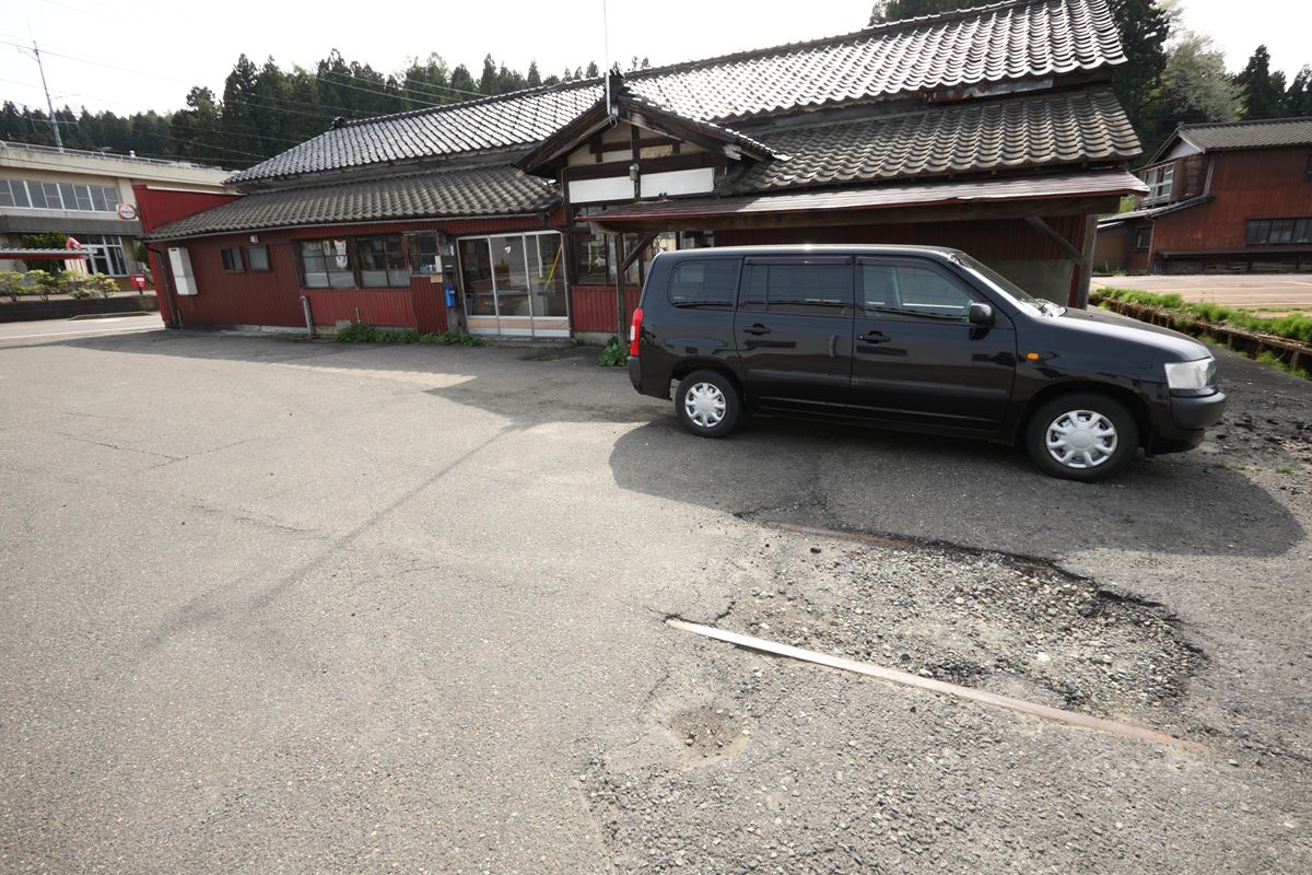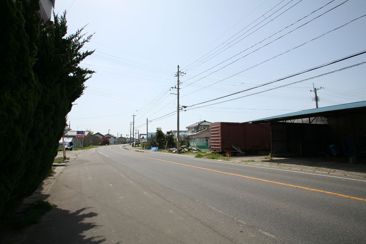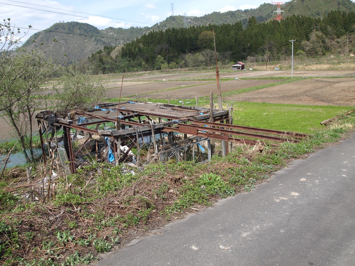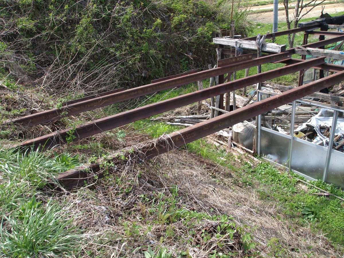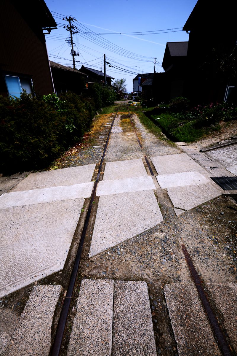 与板の街中には、いまだ越後交通の廃線跡が堂々と残っている。ホーム跡も容易にわかる。関係建築物を解体したものと思しき残骸もある。更地化したところは、運送会社の駐車場になっている。