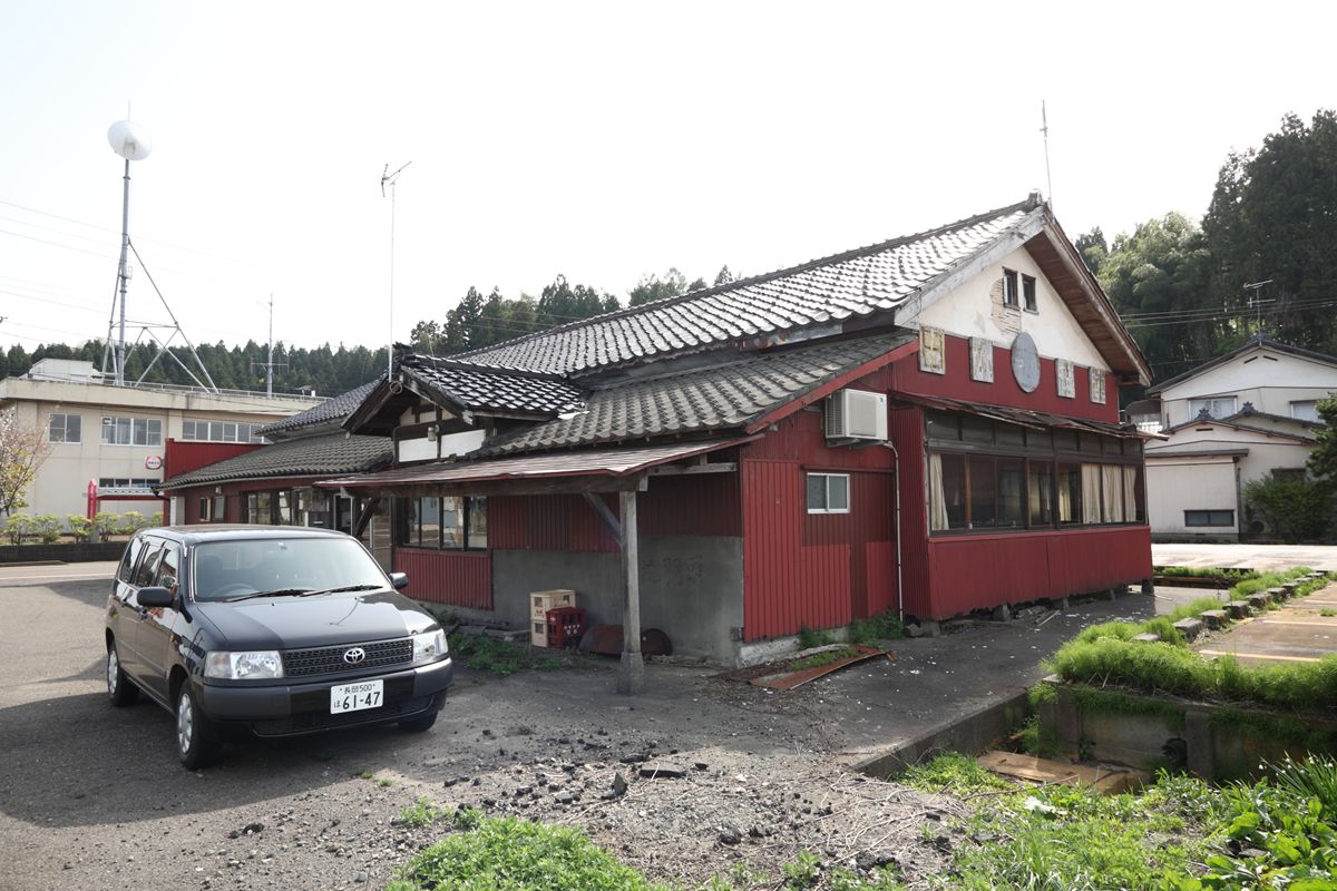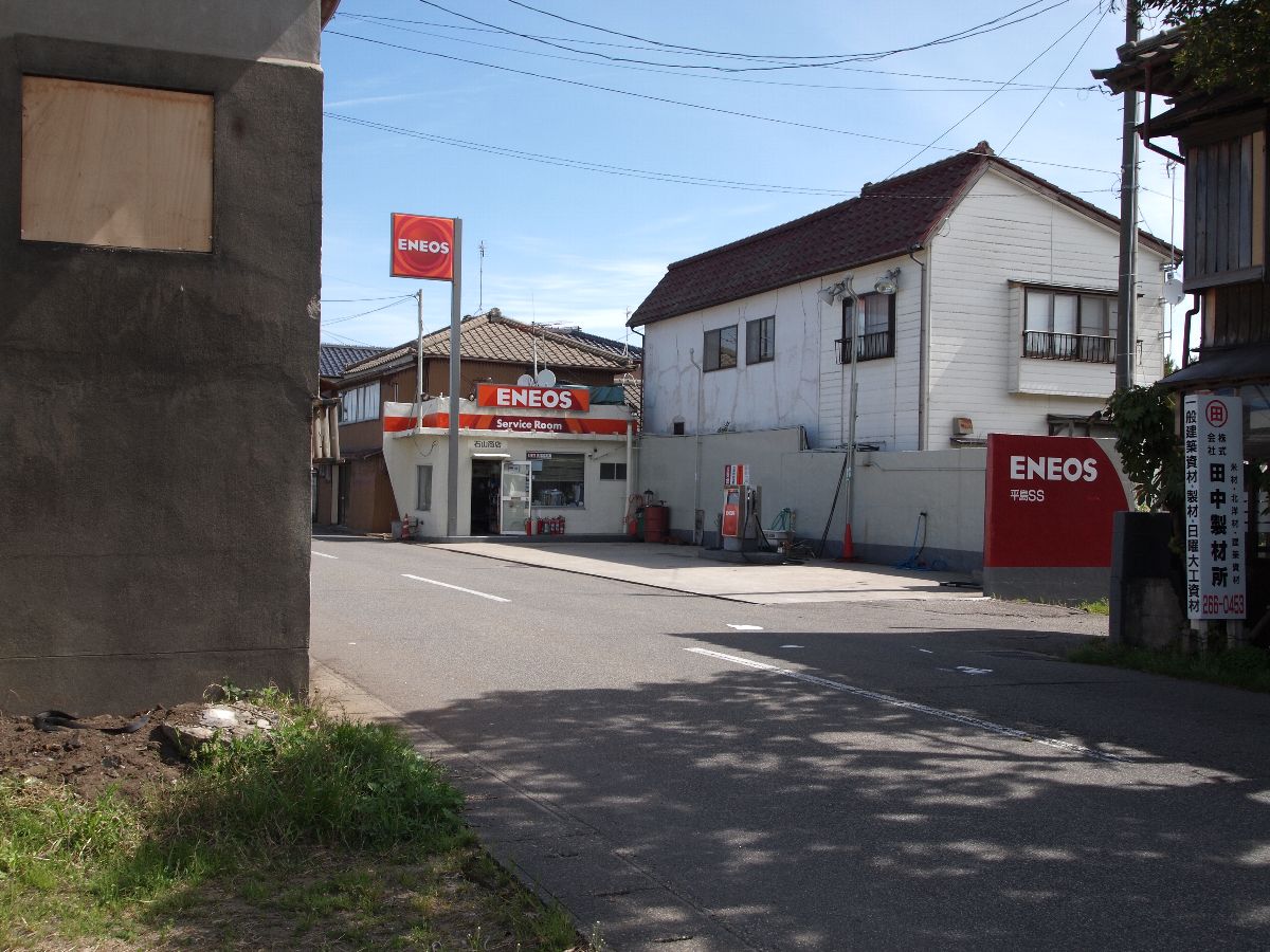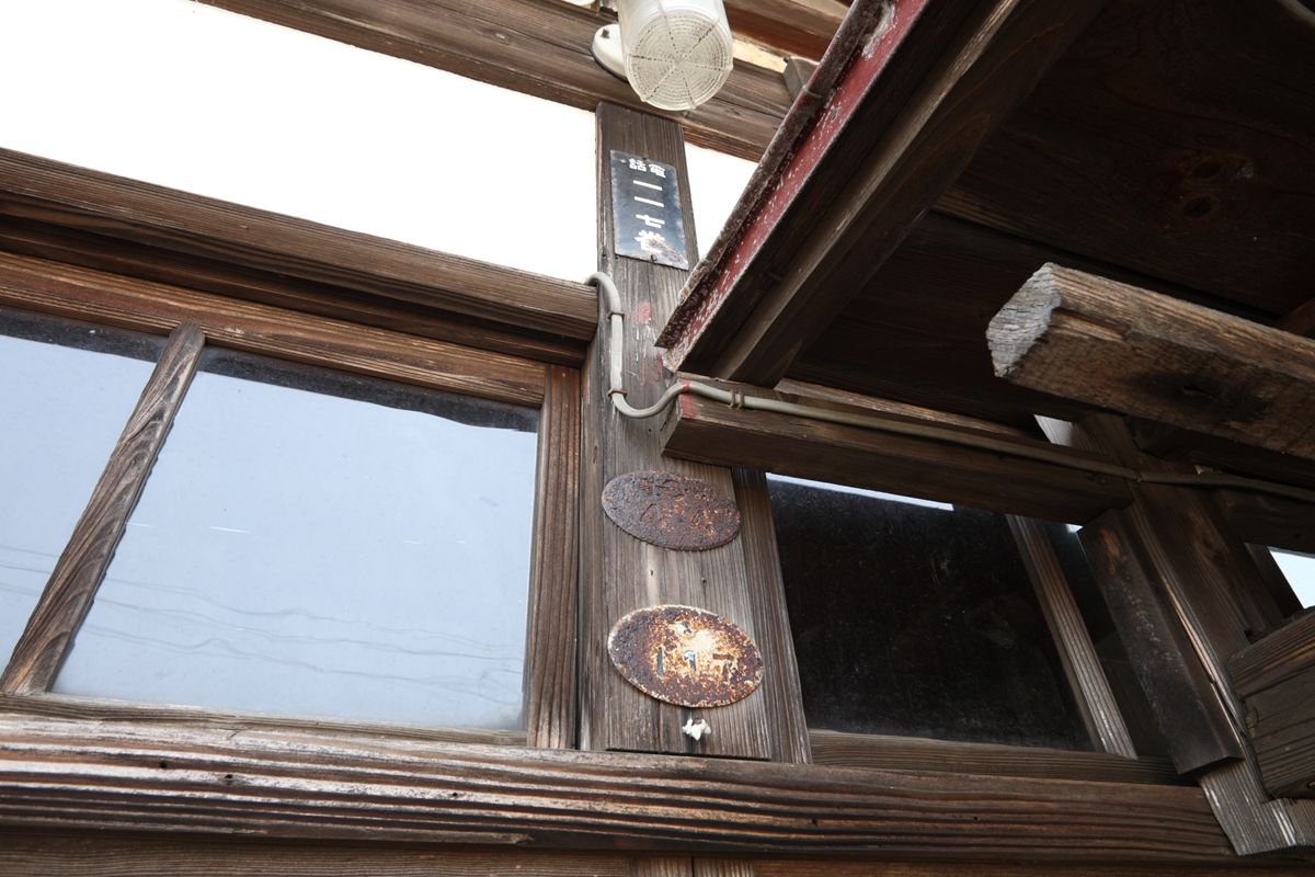 反対側の妻面。道路に面しているためか、3枚の戸。この、おそらく木製フレームに金属板を打ち付けた戸も、新潟ではよく見る。冒頭の写真を見ると、その戸袋がおかしな形で飛び出している。そこに、興亜火災の行灯がある。