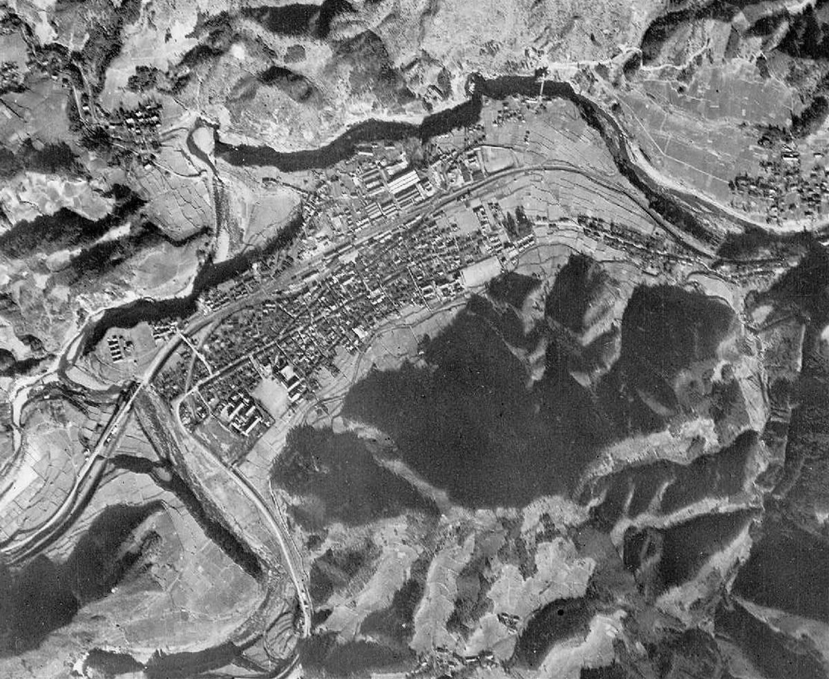 中央本線はまだ単線の時代。当時の航空写真を見ても、現在と同じルートを通っている。大月駅から西へ、堀割で桂川に至り、渡ってからは若干高い位置を走ってまた堀割になる、というものはいまと変わらない。この区間が複線化されたのは昭和41年(1966年)11月30日である。