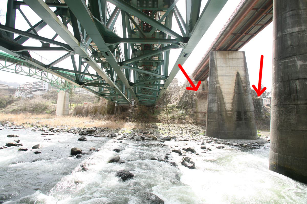 通常、橋梁が鉄橋される際、「河川を占有していた」橋脚は完全撤去を求められると国交省地方建設局の人に聞いたことがあるのだが、ここは例外、というか「体勢に影響ないからそのままでいいよ」となったのだろうか。
