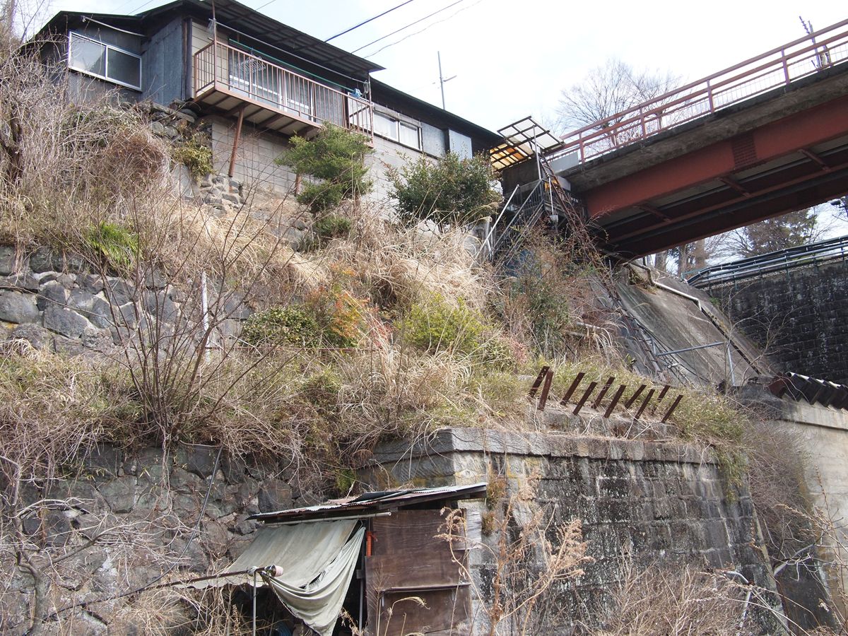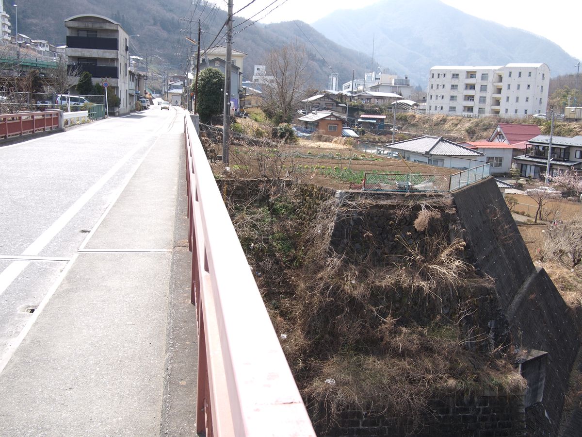 新大月橋の上から見ると、右の橋台はこんな感じ。その上、畑になっているが、そこがかつて道路だったのだろうと推測する。その右にも橋台らしき形状をしたものがあるが、その対岸は完全に擁壁になっているので関係があるのかどうかの推測ができない。