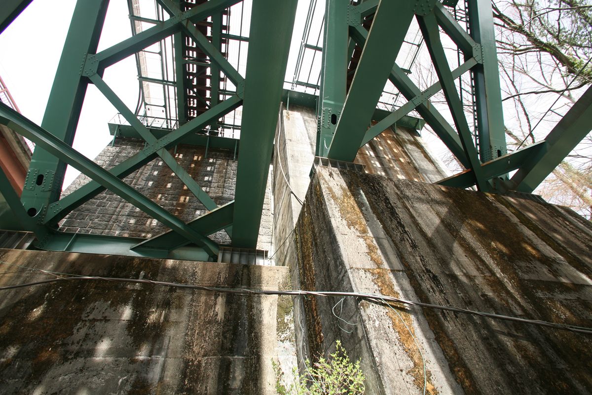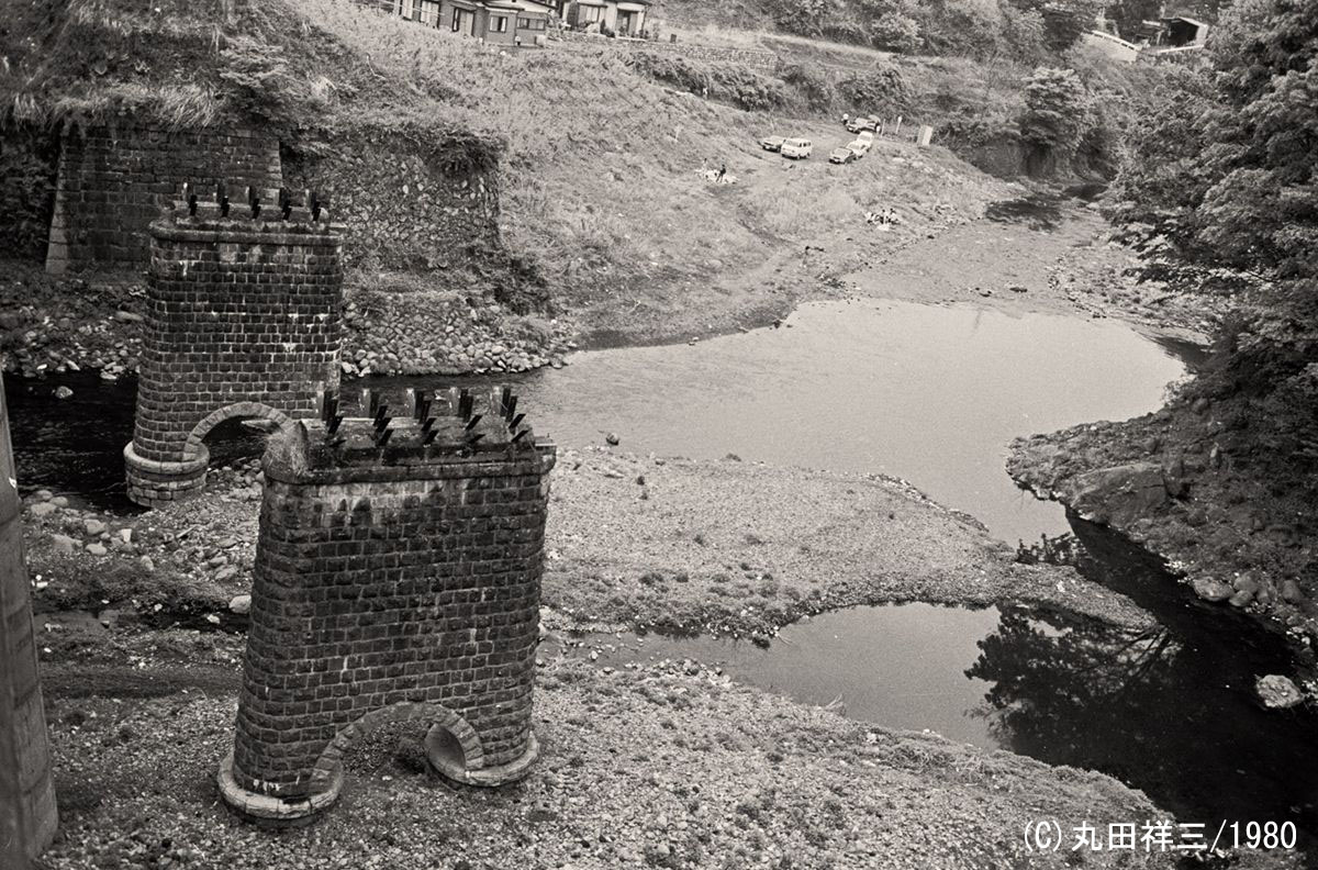 新大月橋から身を乗り出して撮影されたもので、石積橋脚が完全に残っている。そして、その上部を見ると、