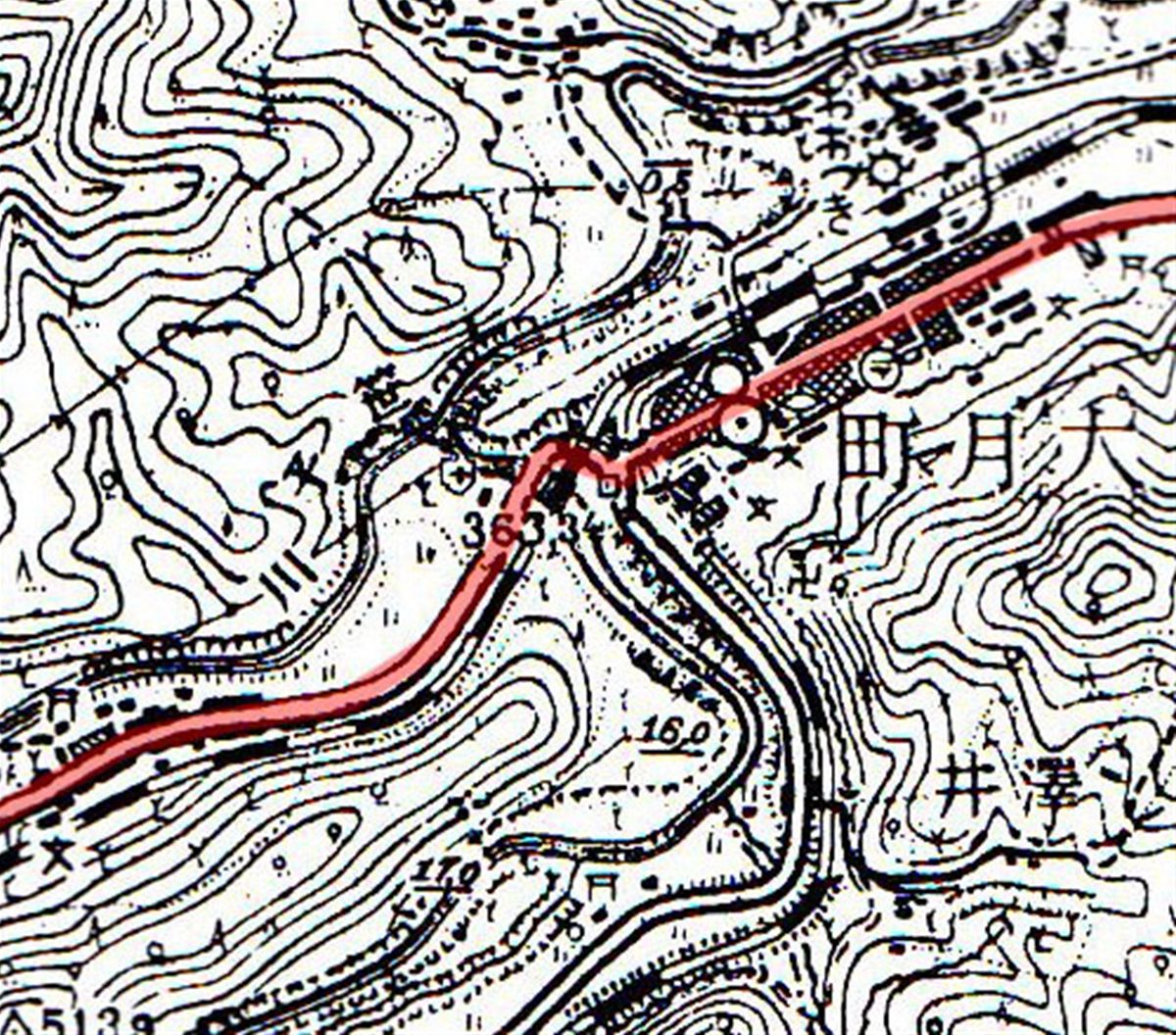赤く塗った部分が、当時の国道20号である。いまの大月橋はない。
