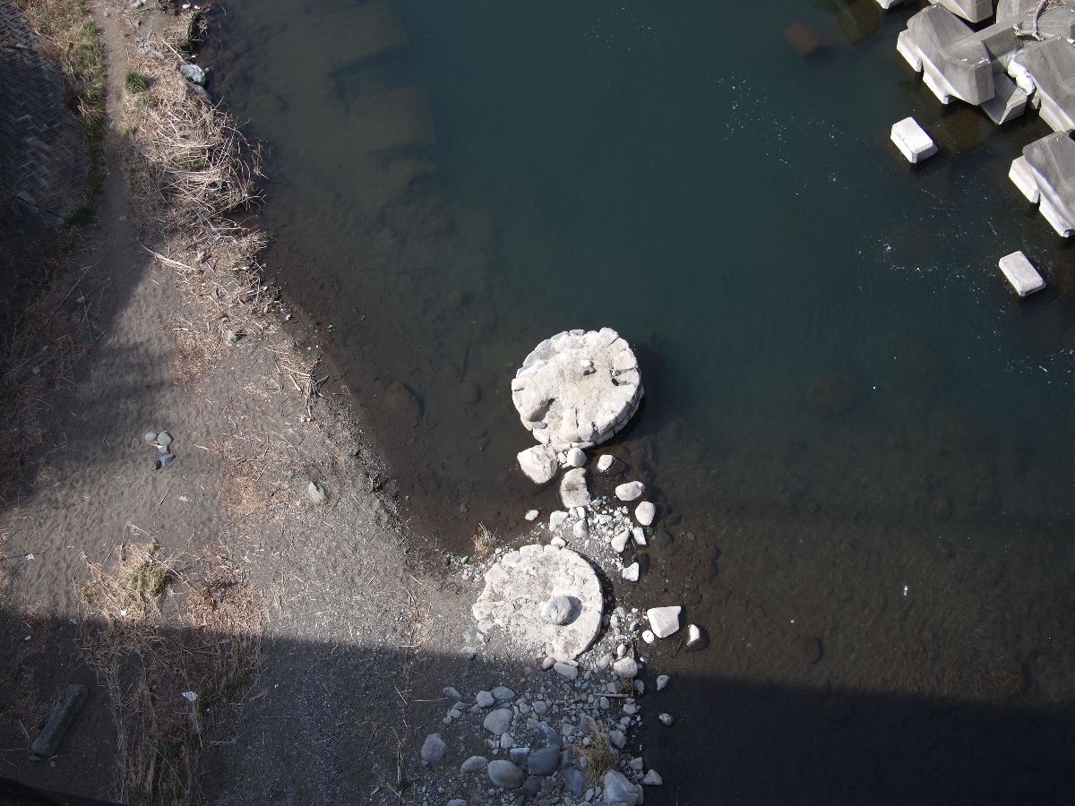 左岸は降りられなかったので、至近距離で撮る羽目になり、ちょっと状況がわかりづらいかもしれない。右に画面から欠けているコンクリート製のが新大月橋下の古い橋台、画面中央の石積みのが古い橋台。