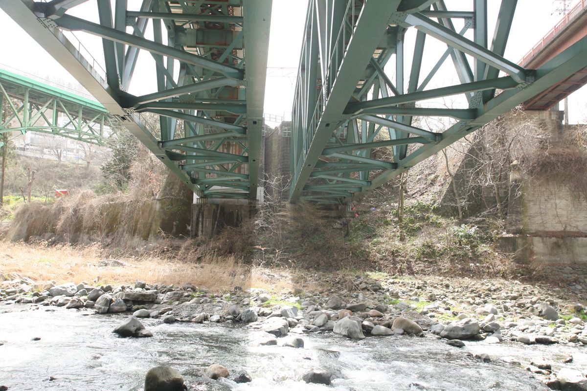 この橋の真下に橋脚が、そしてその北側に橋台と橋脚の痕跡がある。左岸がわかりやすいので、そちらからいこう。
