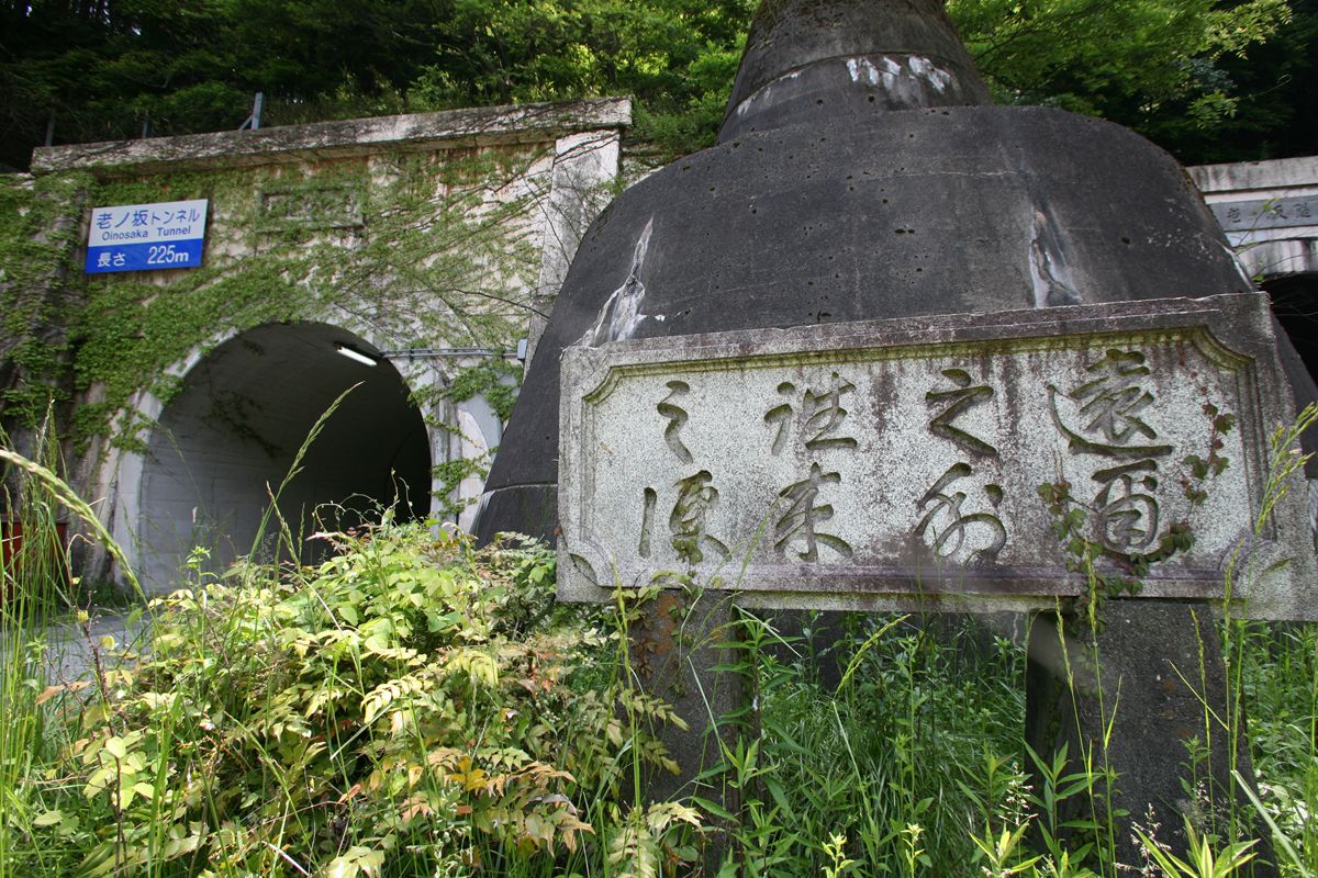なぜここに扁額様のものがあるのか? 現・車道の隧道にも、この歩行者用隧道にも、それぞれ扁額はある。歩行者用の隧道は、草に覆われていて撮影不能。