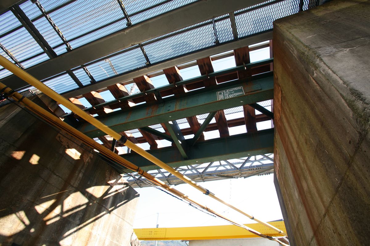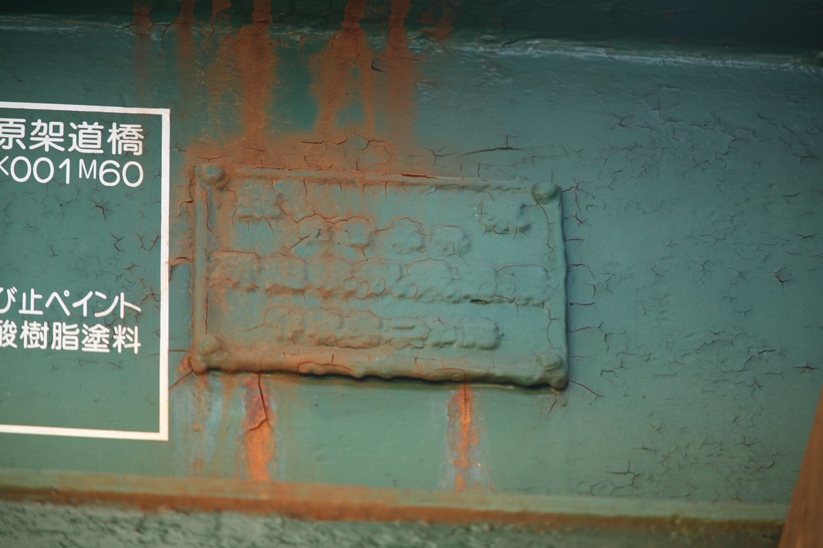 そのまま立ち位置を左にずらすと、ズラリと並ぶプレートガーダーの裏側を見られる。この対傾構(これも対傾構と呼んでいいのだろうか)、なんの根拠もないけれど、ほんとに昭和17年製?という印象(製造年については後述の銘板参照)。