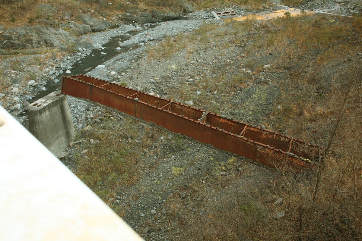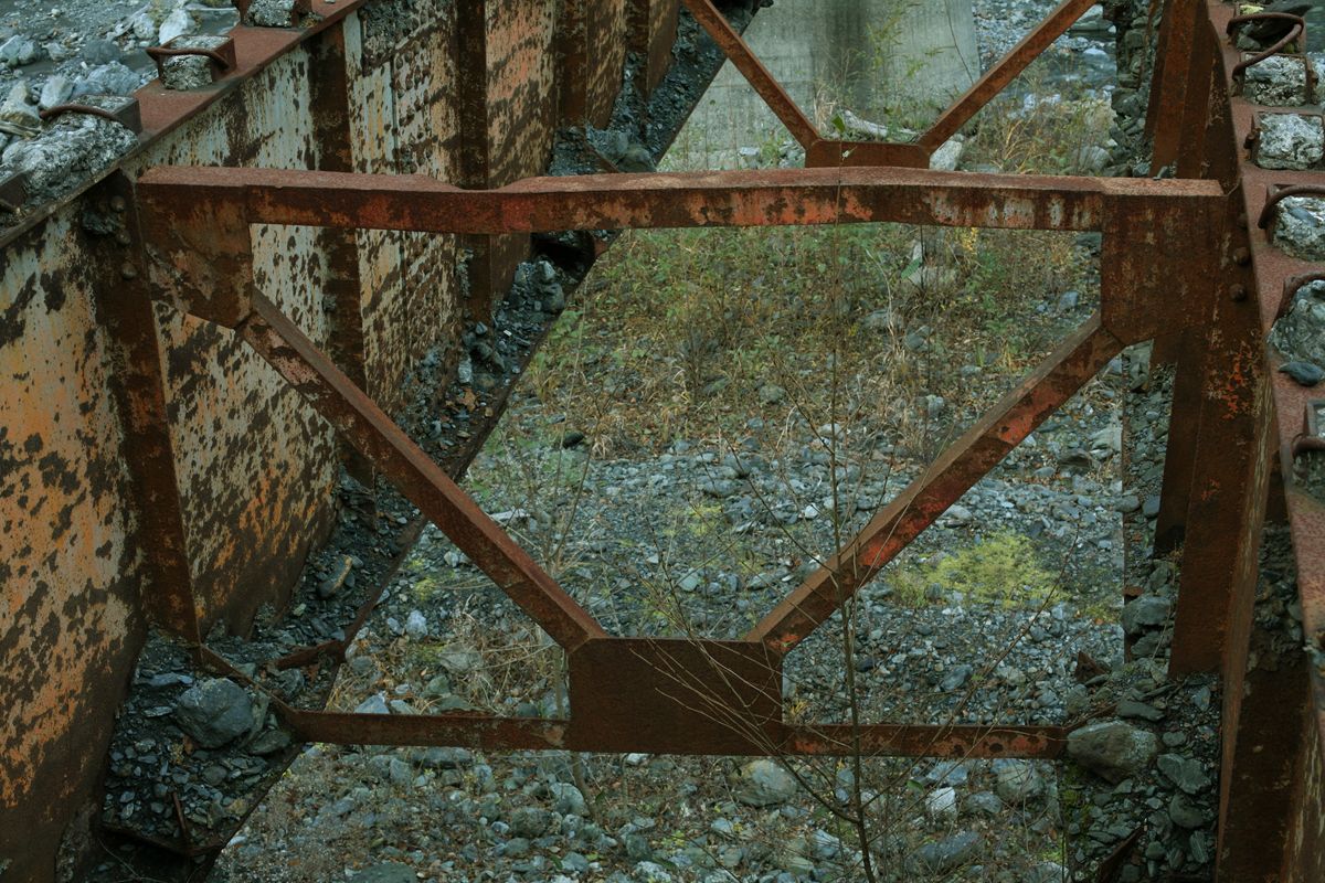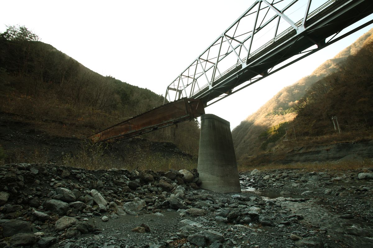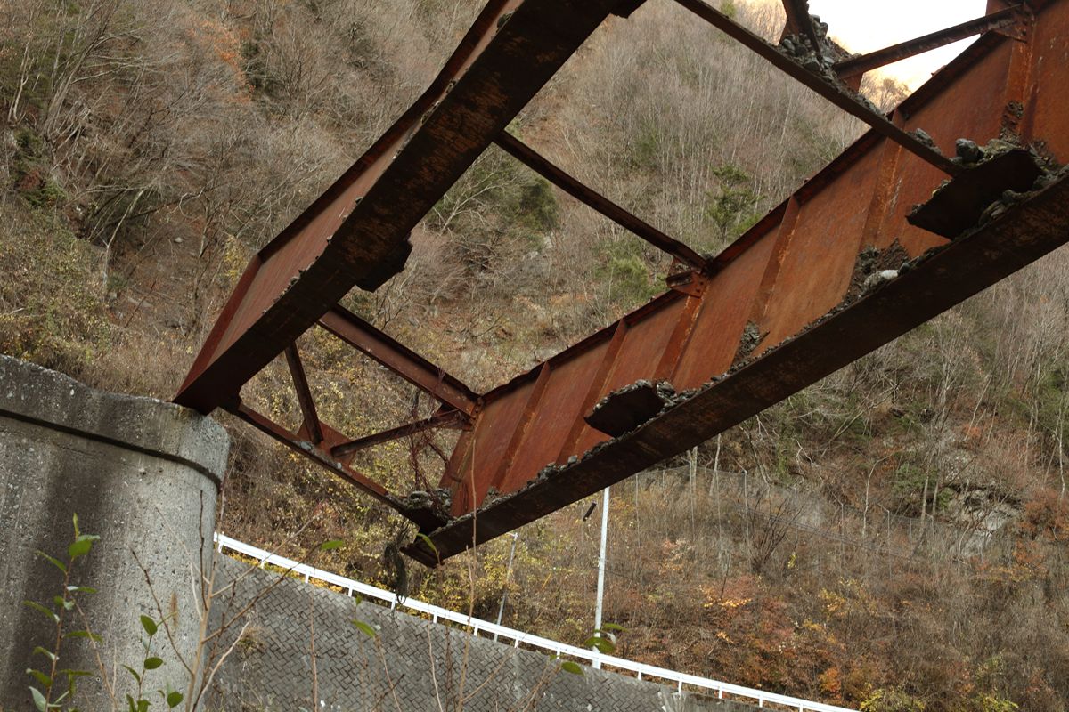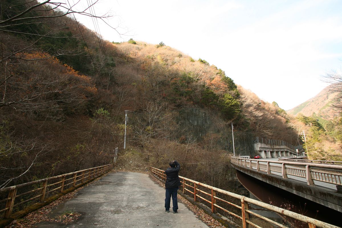 見ての通り、旧道は瓦礫で埋め立てられている。撮影していると、カメラをもった男性が近づいてきて「紅葉、終わってますね」。僕たちは「そうですね」などと返事をしたが、紅葉を撮っているわけではないので、つれない返事に聞こえたかもしれない。新橋は1992年6月竣工。