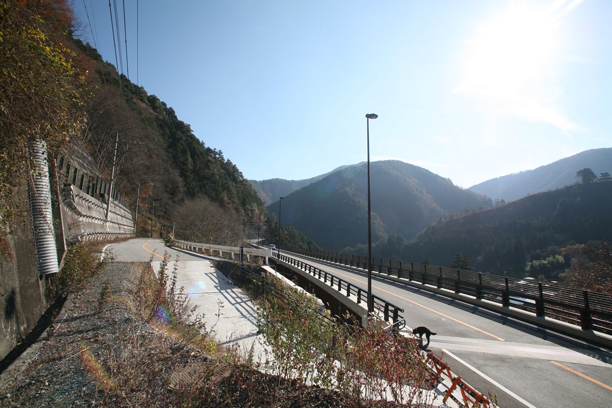 左が旧道、右が新道。右の橋は「丹波山温泉大橋」といい、2009年9月の竣工。供用開始は不明だが、2010年6月27日に開通記念イベントがあったので、今年に入ってからなのかもしれない。名称は、道の駅に接続する温泉にちなむ。