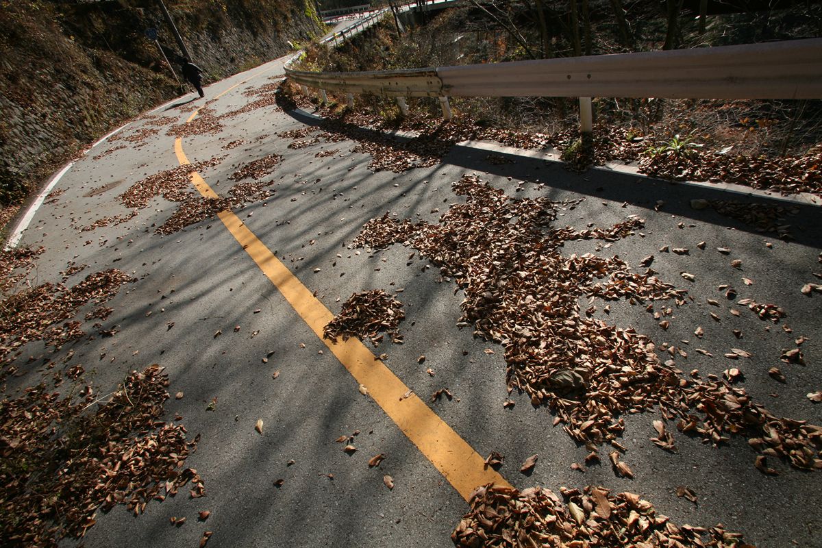 旧道を歩く。風が吹くたび、落ち葉が地面を走っていく。それを流し撮りしたかったのだが、無理!画面奥が丸田さん。