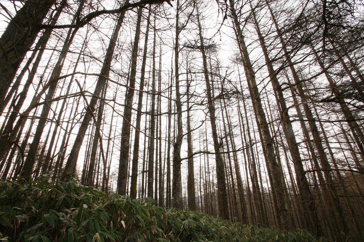 ずっと青空だったのだが、目的地が近づくにつれ、ちょっとかげり始める。山を埋め尽くす樹木には杉以外は葉がほとんどなく、そのすべては僕等の足下にふかふかに積もっている。