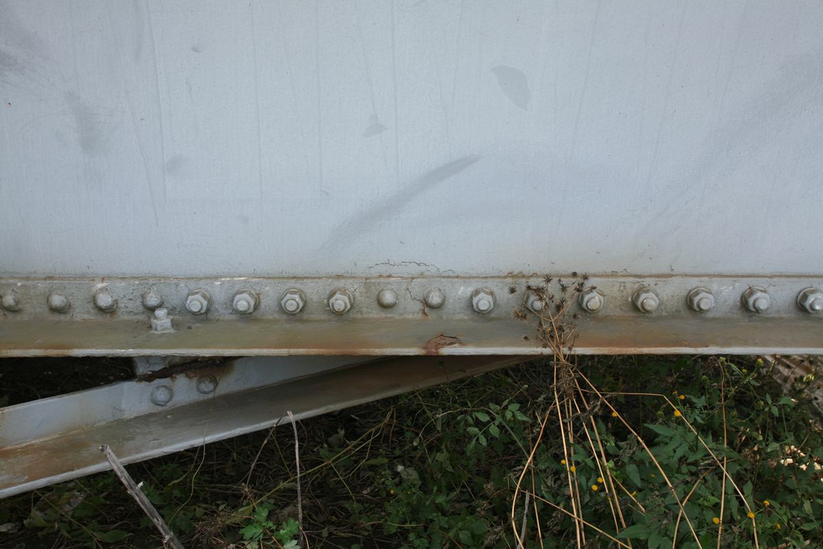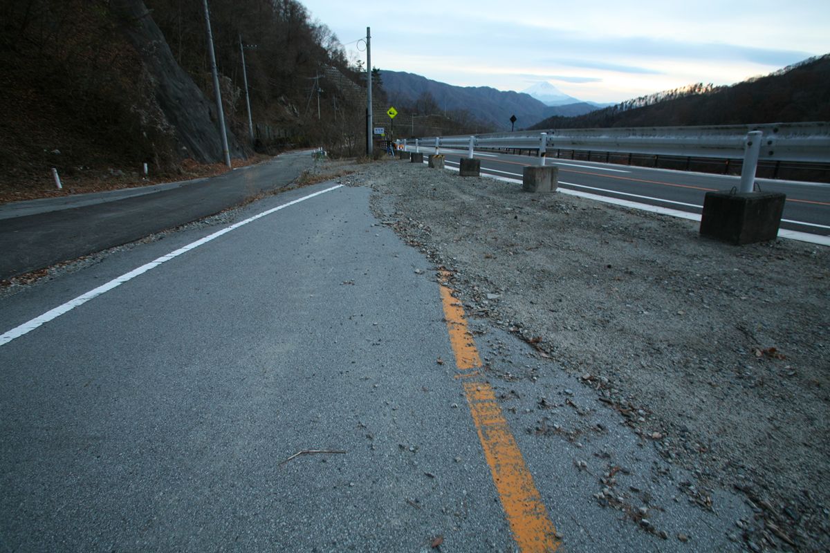 この旧道、上記写真のとおり、山肌に沿ったカーブを、ひとつの大きな橋で短絡したもの。新道のほうが法面が低く、旧道と高さの差が大きい。隣接するJOMOの出入り口も、かなり無理な勾配になっている。そして、旧道は、新道に欠き取られた形になっている。欠き取られた部分は舗装がはがされて砂利になっている。砂利は非常に強く突き固められている。