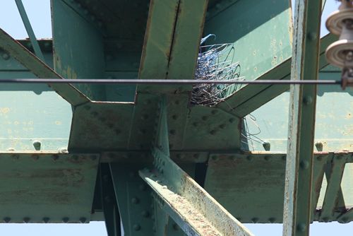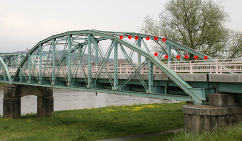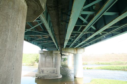 ボーストリングとは、側面から見た形状を、ボウ(弓)とストリング(弦)に見立てての名称だ。この形式は、開口面積を確保するために橋門構(画像に赤い点線で示したような部材だとお考えいただいて大きくは違わない)を設置できないため、この部分の強度が低くなってしまうという欠点がある。そのため、明治以降、九州や福島県で局地的に使用された以外はほとんど採用例はないのだが、水路橋や水管橋のように、開口部が狭くてもいい場合には、ボーストリングトラスもそれほど不利でもないのかもしれない。このへんはあくまで素人考えなので、専門家がいらっしゃったらご指摘いただきたい。なお、新潟県にこの橋のさらに特殊な使い方をした廃道がある(