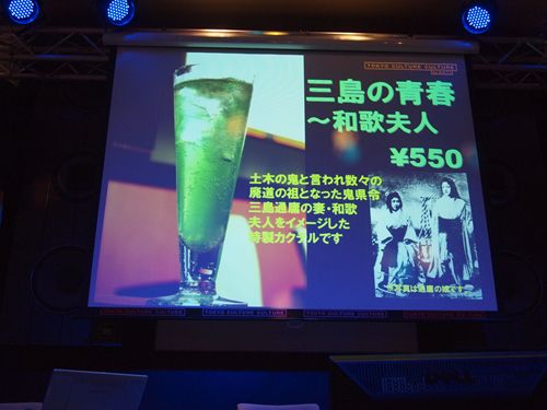 オレンジ色のカクテル、「三島の黄昏」は比較的スムーズに決まったが、対応する緑をどうするか。「○○隧道の苔」「対応しないなー」「三島に対応して藤村紫朗か」「マイナーすぐる」…。細田氏「グリーン(自粛)」ヨッキ氏「却下!」…。悩んだ末、「三島の青春」となった。副題に「和歌夫人」。これくらいのわけのわからなさがちょうどいい。