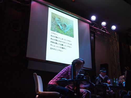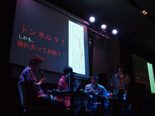 再開。ここから第二部、トリ氏と細田氏は「探索時の正装」に着替えているのだが、コーナーが続いているためその説明がなかったので気がつかなかった人もいたかも…。細田氏は「いつものツナギ」で電車に乗っていらしている。